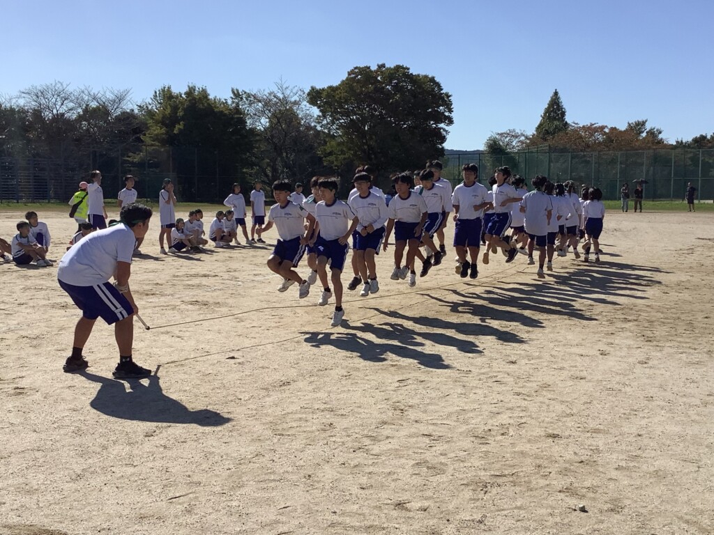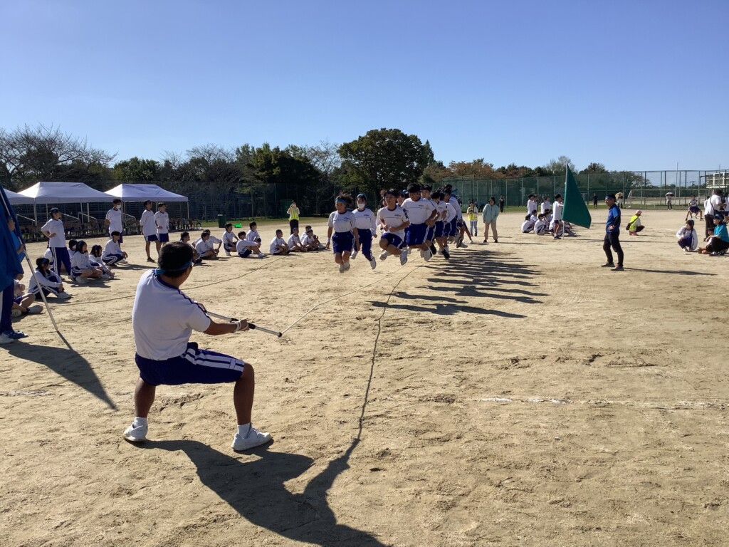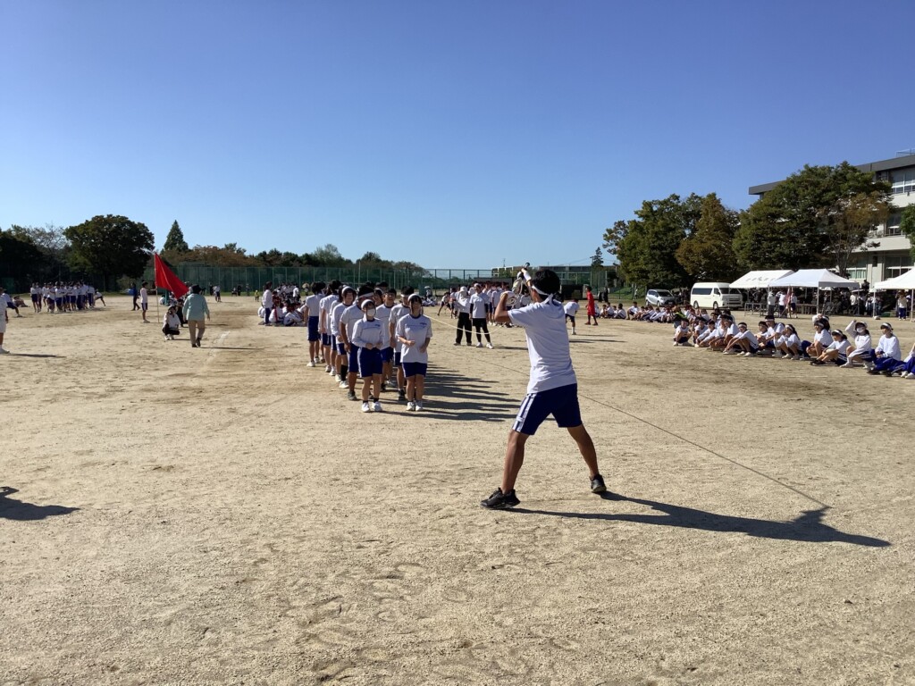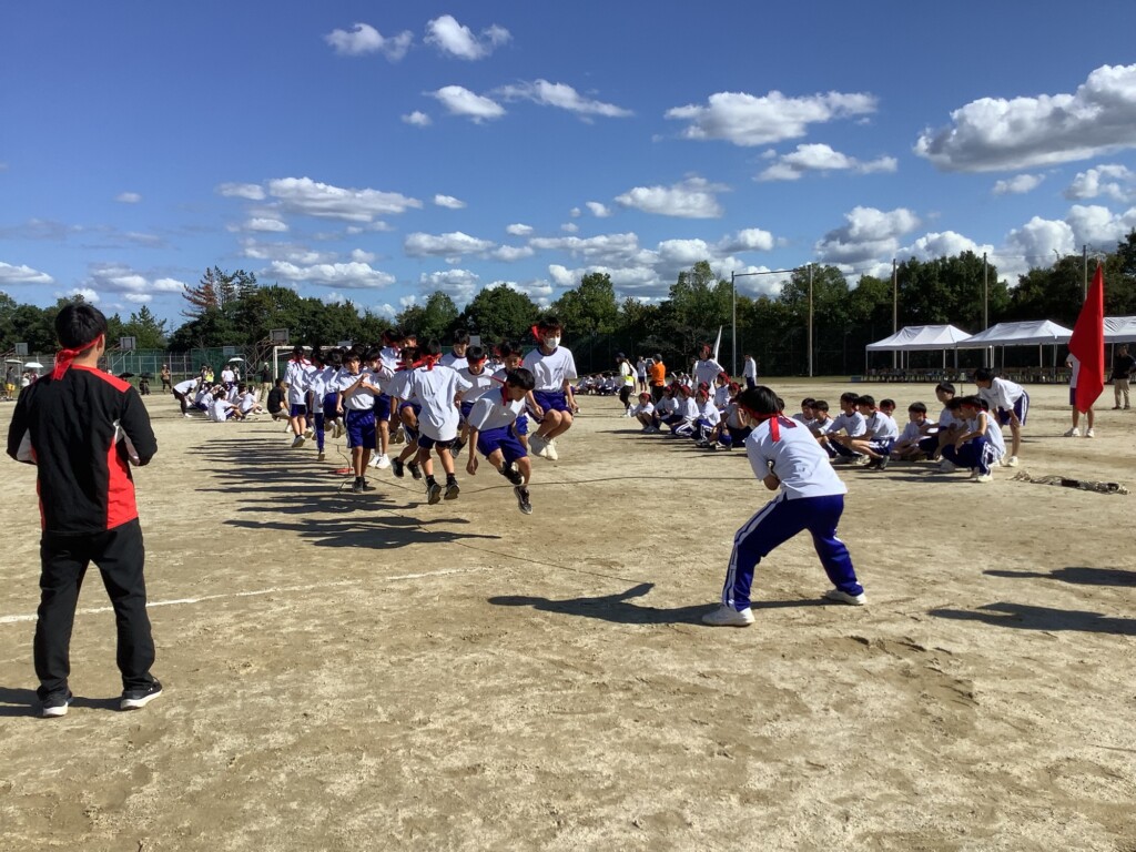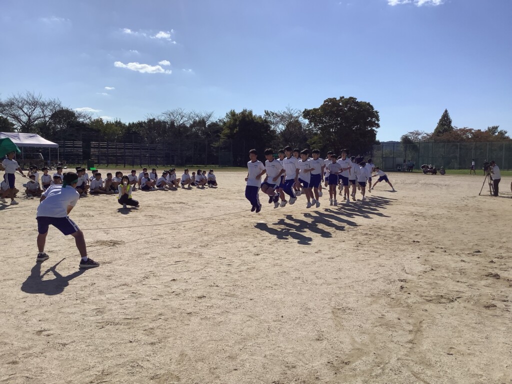 1日雨で延期された今年度の体育祭。雲一つない爽やかな秋晴れのもと本日実施しました。早朝のグランドの水取り、グランド整備に生徒たちが何人も駆けつけてくれて、あっという間に準備完了。「学級対抗リレー」「生徒会種目」に続いて観客を巻き込んだエキシビジョン「綱引き」。参観に来ていた北栄小学校の5年生にも参加してもらいながらスローガン通りの笑顔溢れる時間となりました。午後からは学級対抗大縄跳び。まさしく各学級のプライドをかけて、全力で縄を跳び続けました。最後に団対抗リレー。選りすぐりの精鋭が自慢の俊足を競いました。結果、白軍が取組優勝と総合優勝の2冠達成。3年連続白軍に優勝旗が渡りました。「一生懸命がかっこいい」姿溢れる体育祭となりました。