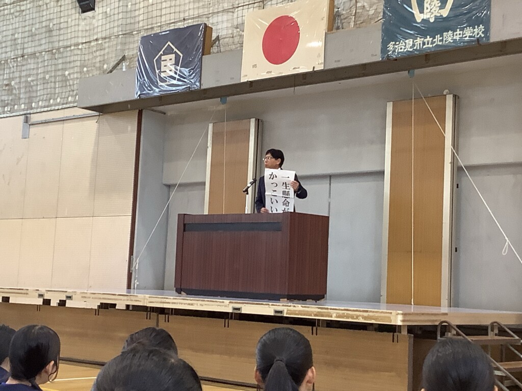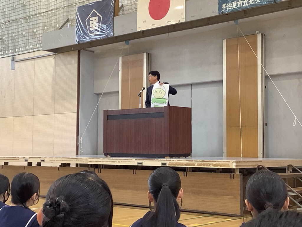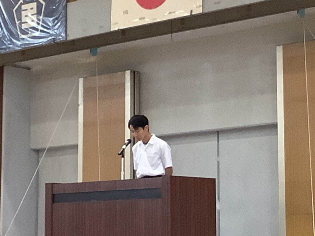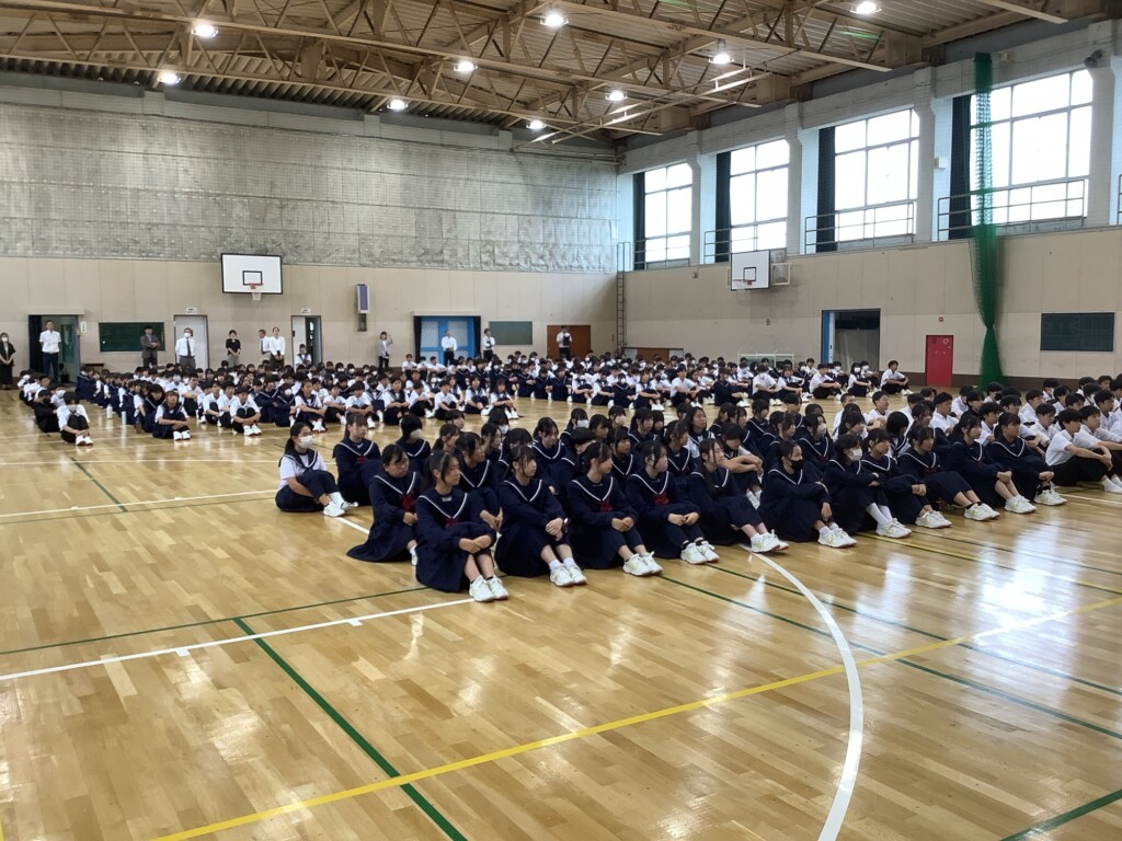 10月14日、後期始業式を実施しました。学校長から「一生懸命がかっこいい」姿を目指すこと、玉井るい後期生徒会長から生徒会スローガンである「pride」のもてる自主的な活動を創り出すこと等の話がありました。今回は椅子を用意してしませんでしたが、大変集中して話を聞く姿が印象的でした。