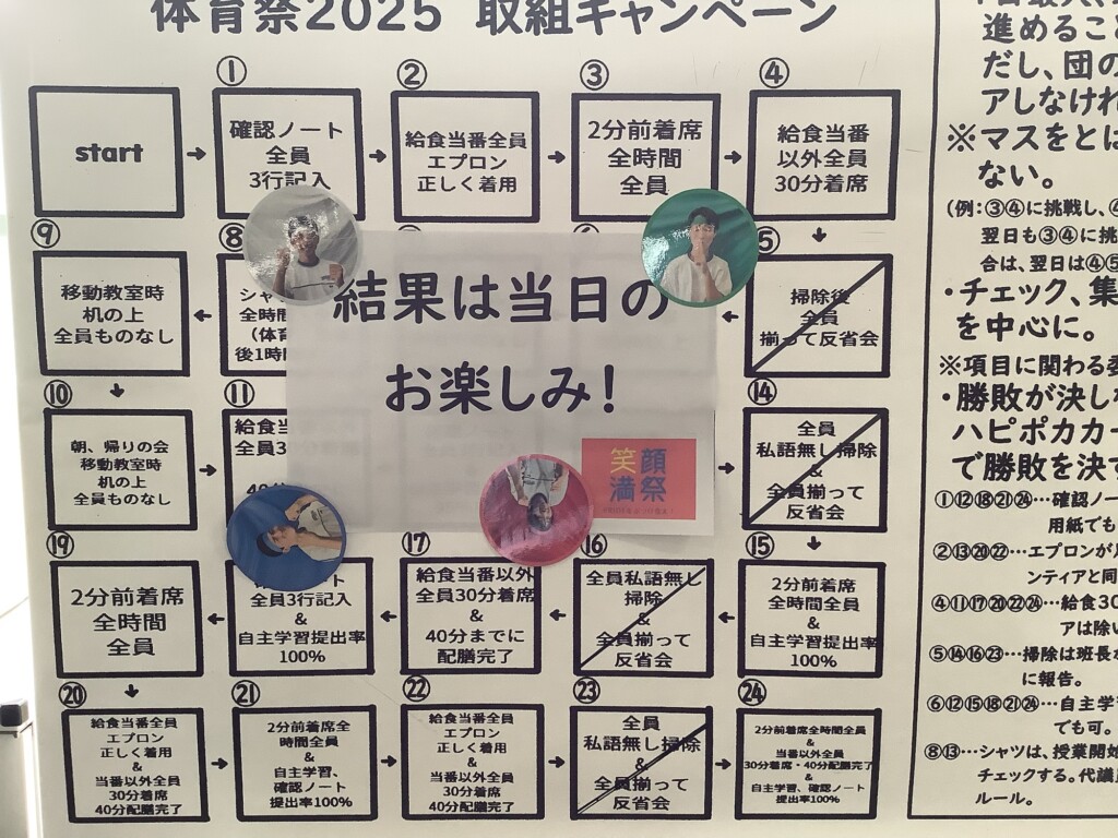 明日10月16日に予定されていた体育祭は、明日雨の予報のため、明後日10月17日に延期とさせていただきました。夏休み明けから取組を頑張ってきた生徒たちに、快晴と良いグランドコンディションのもとで体育祭を実施させてやりたいという思いからの苦渋の選択です。保護者の皆様、保護者の皆様には大変ご迷惑をおかけしますが、ご理解とご協力のほどよろしくお願いします。