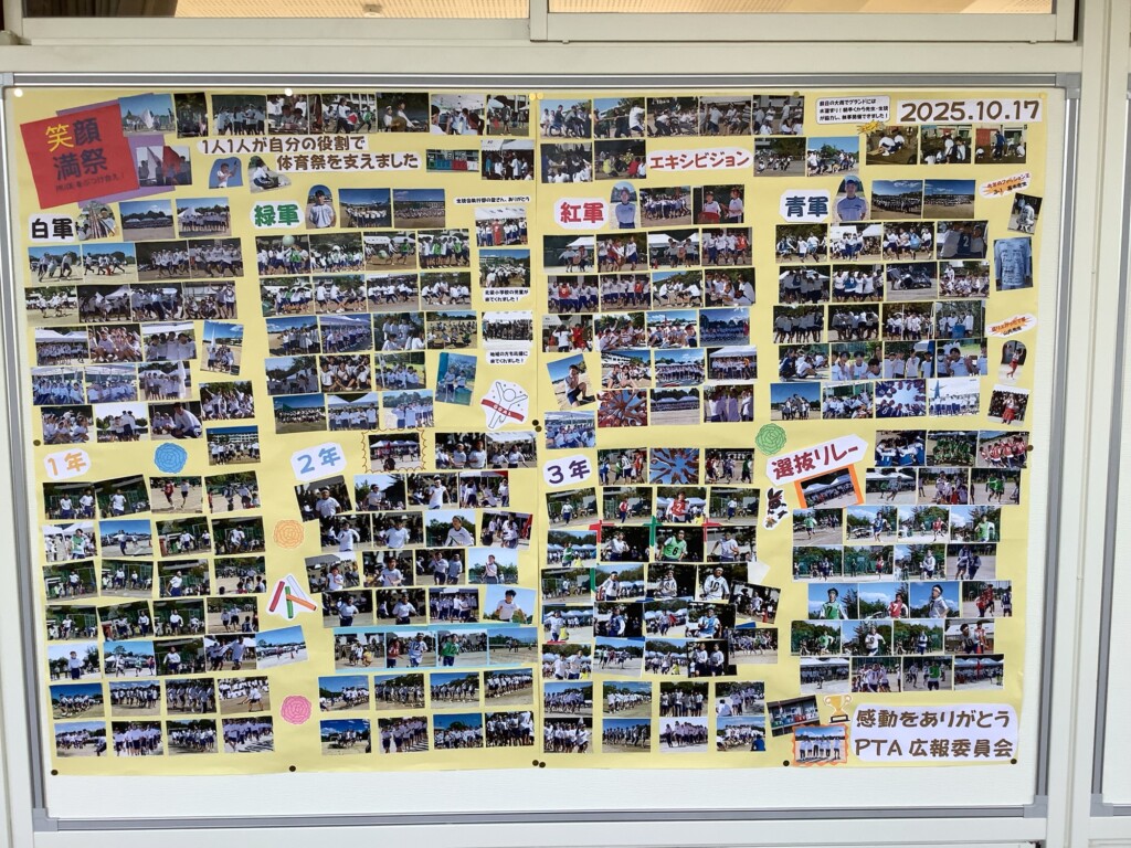 また、先週、保護者の有志が集まり、体育祭の際に、PTA広報委員会の撮った写真を使って素敵な掲示物を作成してくださいました。北舎2階の会議室前に飾ってくださっています。ありがとうございます。