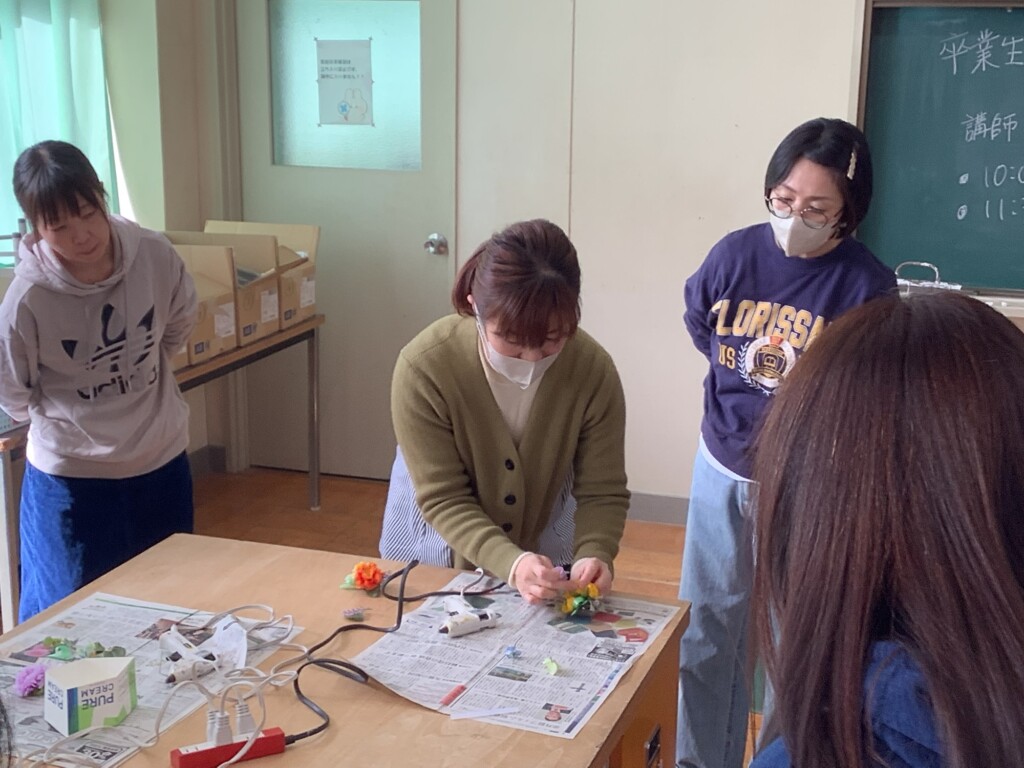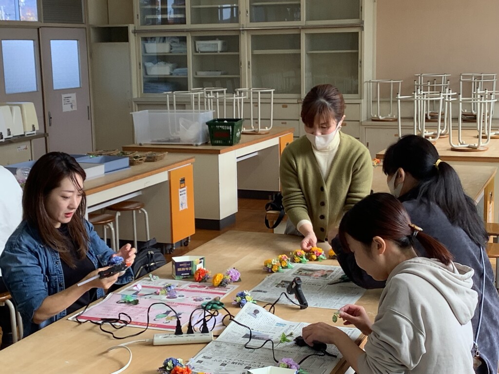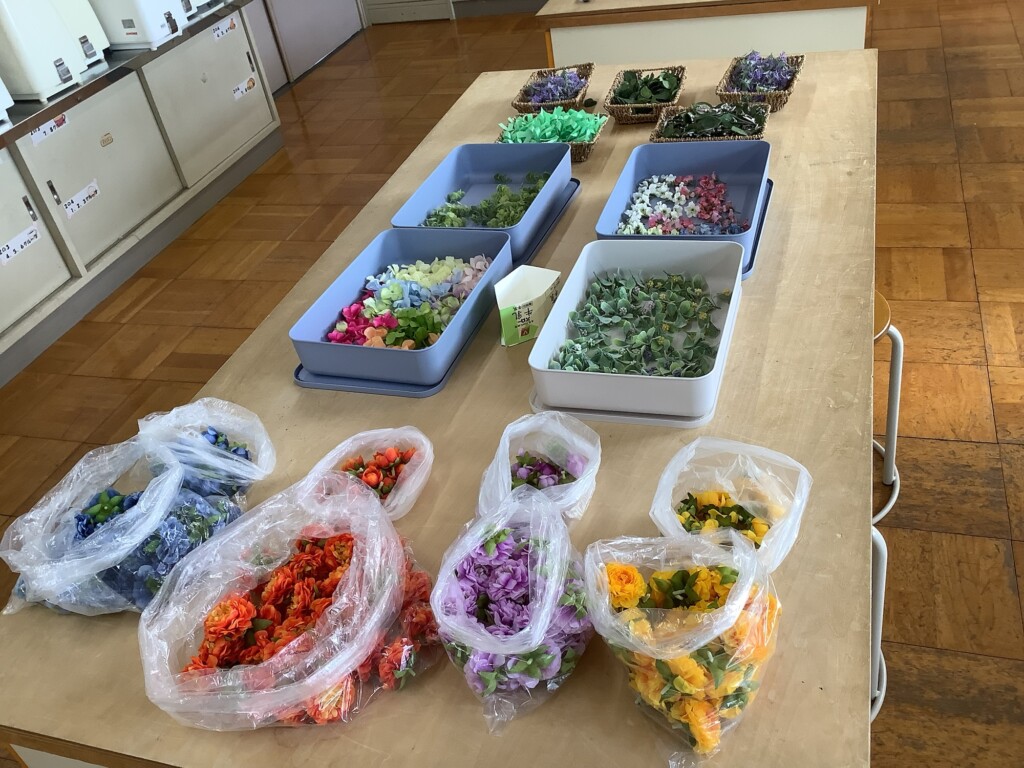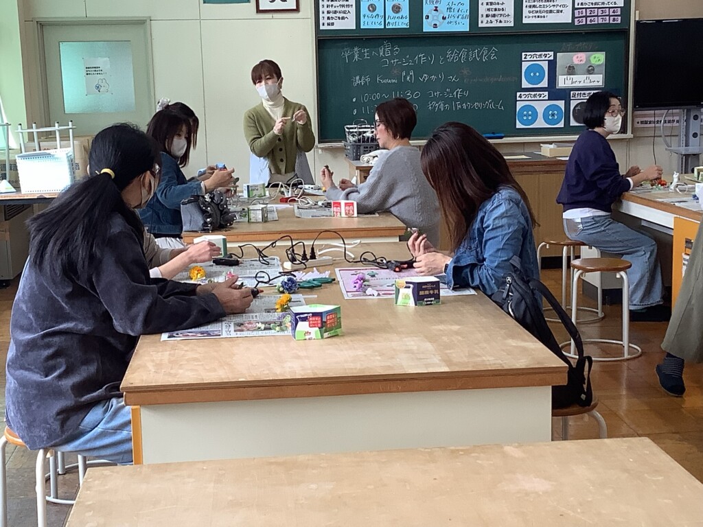 本日午前中に、今年度の卒業生が胸につけるコサージュ作りをPTA家庭教育委員さんが中心となって行いました。10名余りの有志の方が集まってくださり、心のこもった可愛いコサージュを卒業生分作成してくださいました。卒業式に文字通り花を添えてくださいます。ありがとうございます。