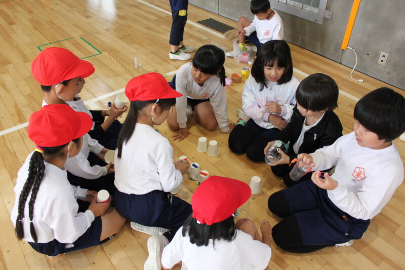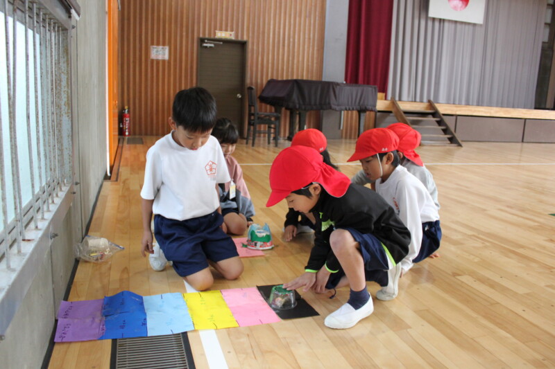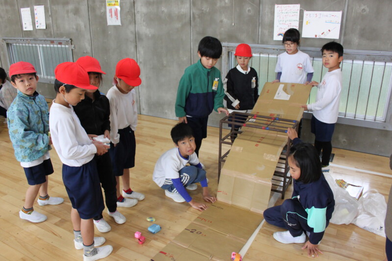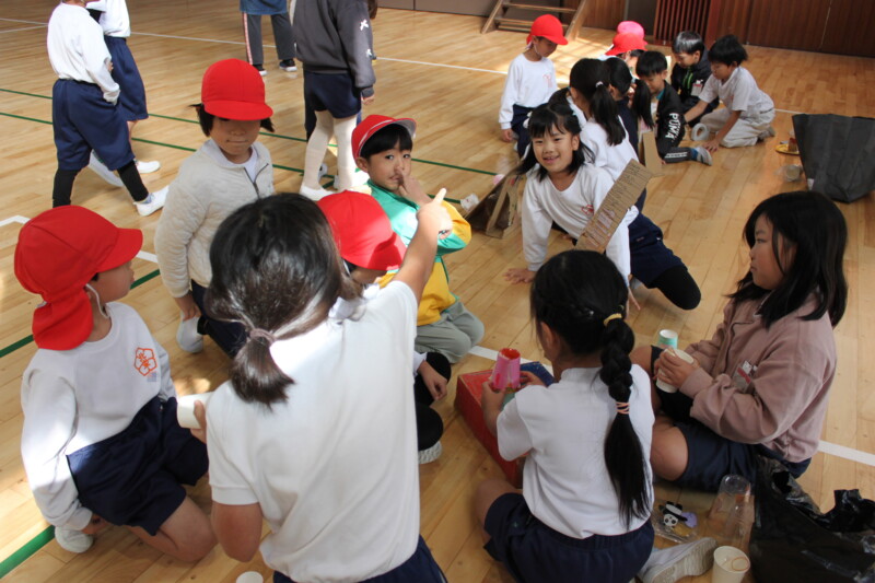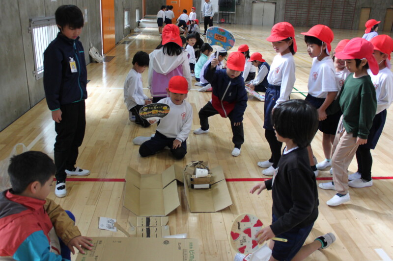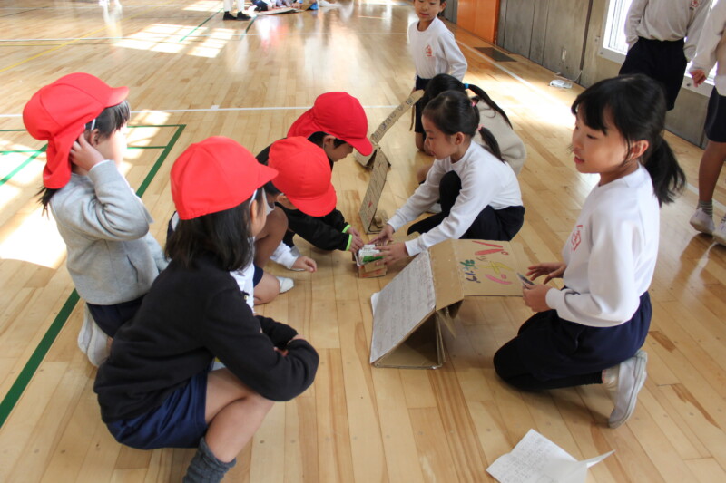 生活科「うごく うごく わたしの おもちゃ」の学習で、2年生が自分たちで考えたおもちゃを作り、楽しく遊ぶ活動を行いました。
