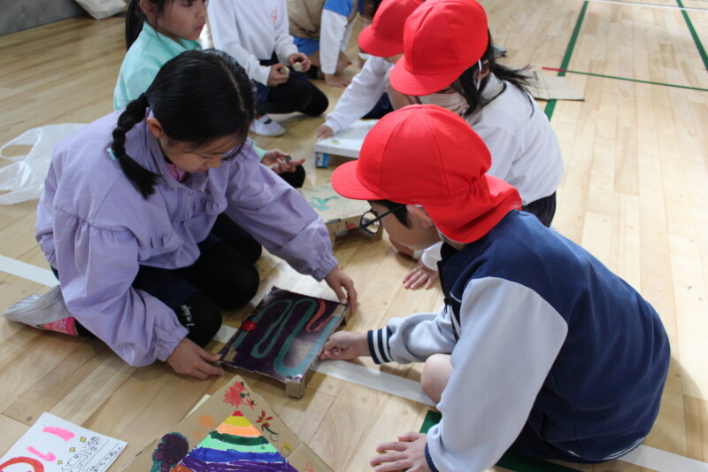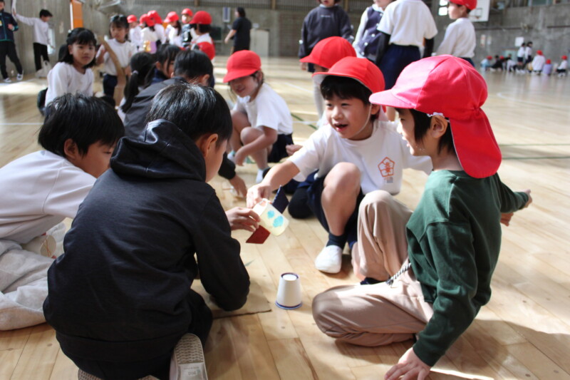 そして今日の2時間目、ついに1年生を招いて「おもちゃであそぼう会」を開催! 2年生は、おもちゃの遊び方をやさしく説明したり、「すごいね!」と声をかけたりと、頼もしいお兄さん・お姉さんぶりを発揮していました。1年生の子たちも、楽しそうに遊んでくれて、2年生の子どもたちもとても嬉しそうでした。
