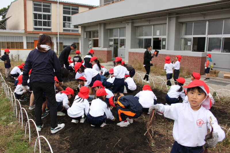 生活科の学習で育ててきたサツマイモが、ついに収穫の時を迎えました。先生に掘り起こしてもらった畝の中で、子どもたちは軍手をはめ、土の中を一生懸命掘り進めます。
