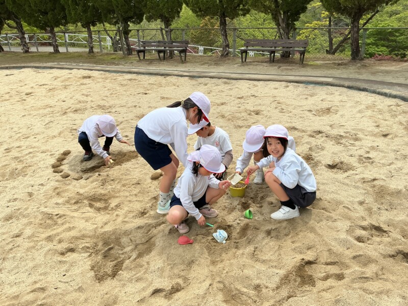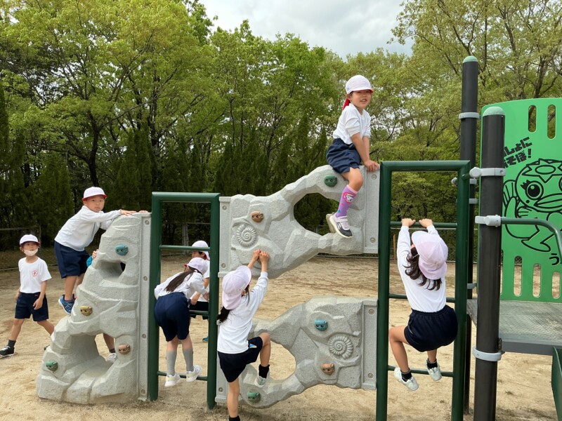 4月 17 2026 仲間つくり活動(2年生) 学校近くの旭ヶ丘公園に行き活動しました。学校の中とは少し違う場所、いろいろな遊具で遊んだり、砂場で遊んだりと学年の友達と一緒に楽しく活動しました。 上までのぼりたい! 何をつくってる?