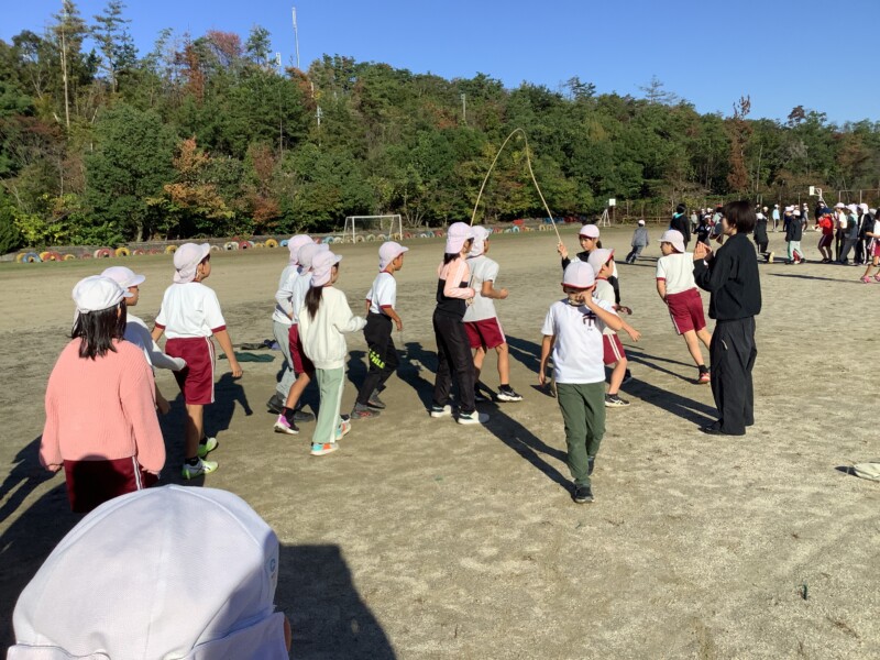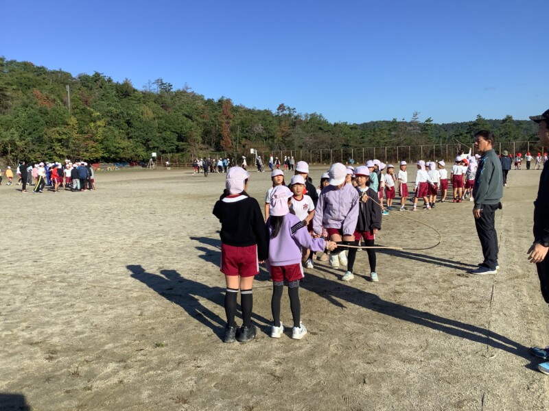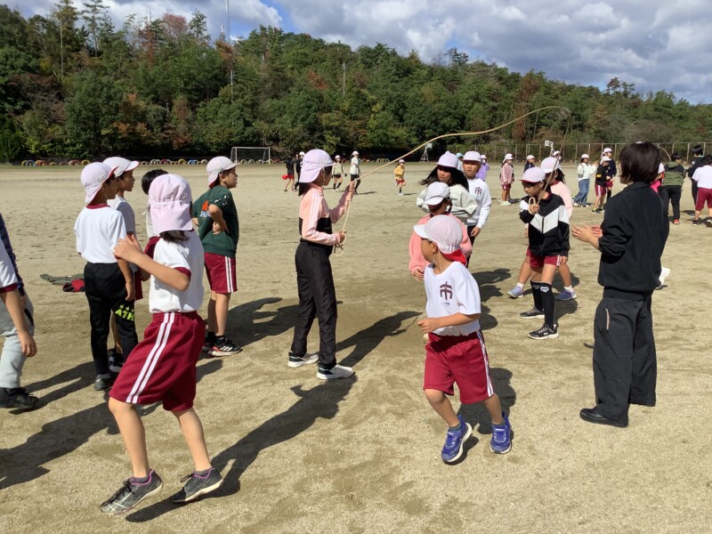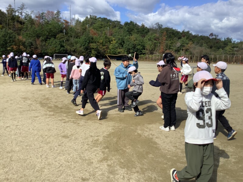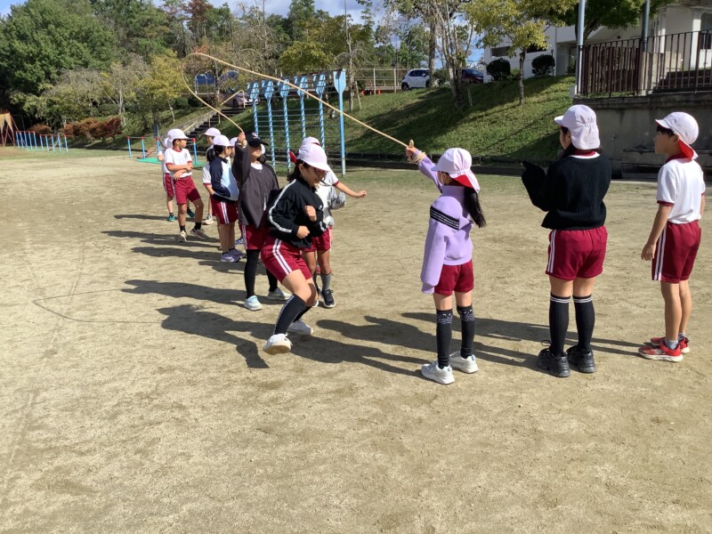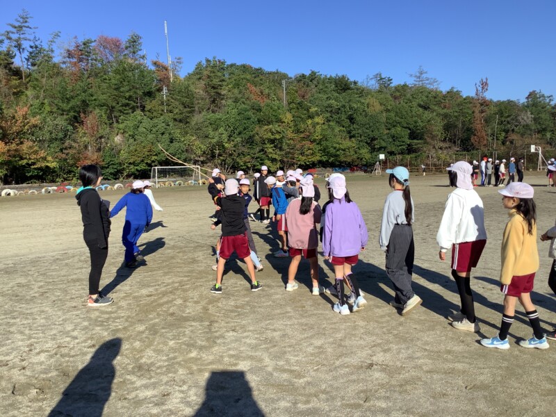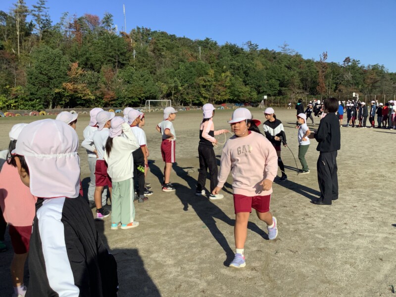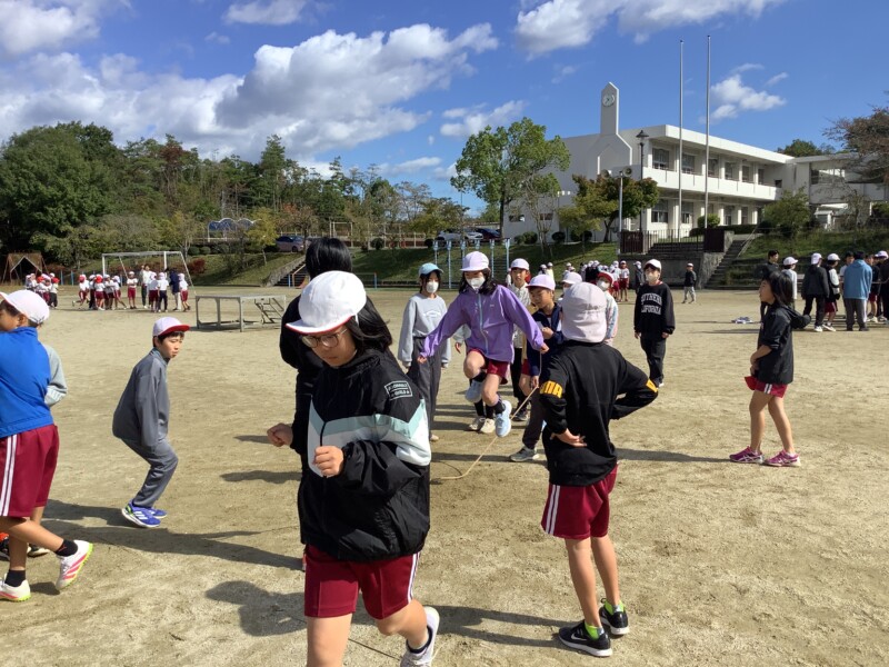 今朝も秋のすがすがしい天気です。グラウンドで全校一斉に8の字跳び練習会がありました。各学級で練習していても、全校でそろってする練習は少し緊張感があるようです。