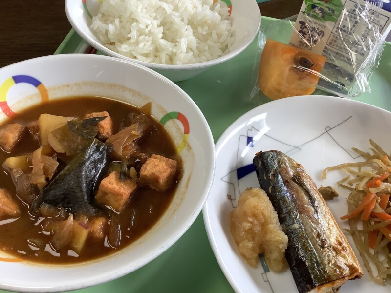 今日の給食は、秋刀魚(大根おろし付き)にさつまいもの味噌汁、柿と秋満載でした!ごちそうさまでした❗️