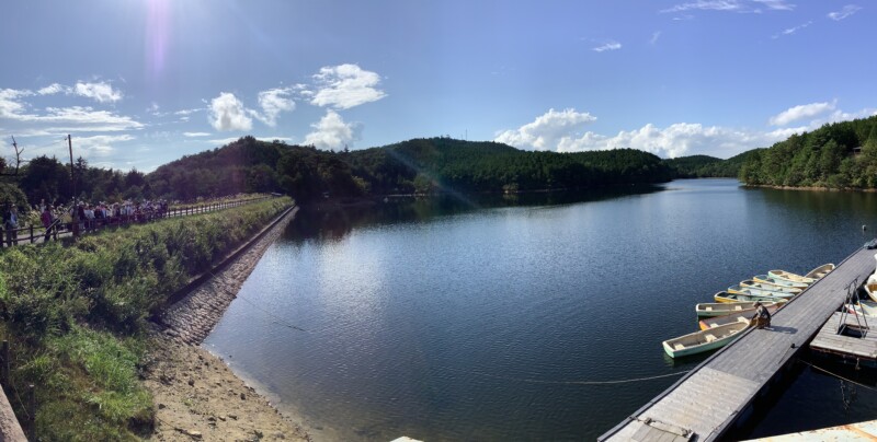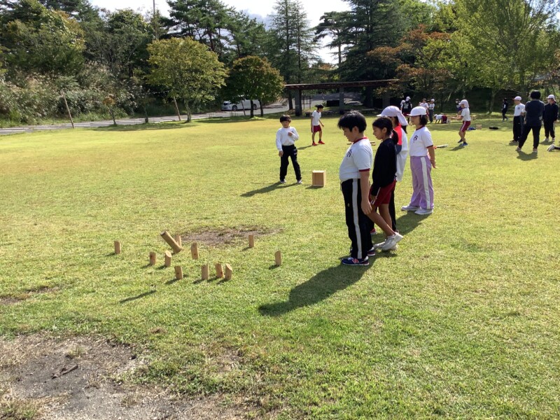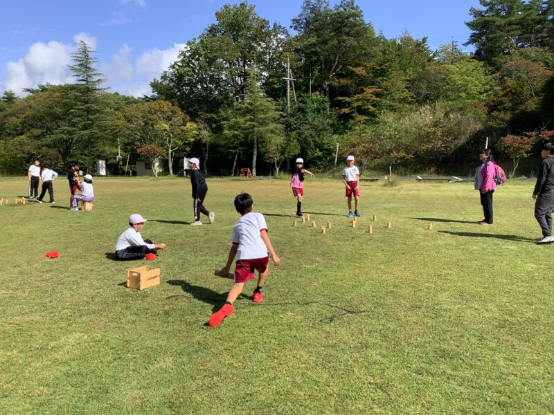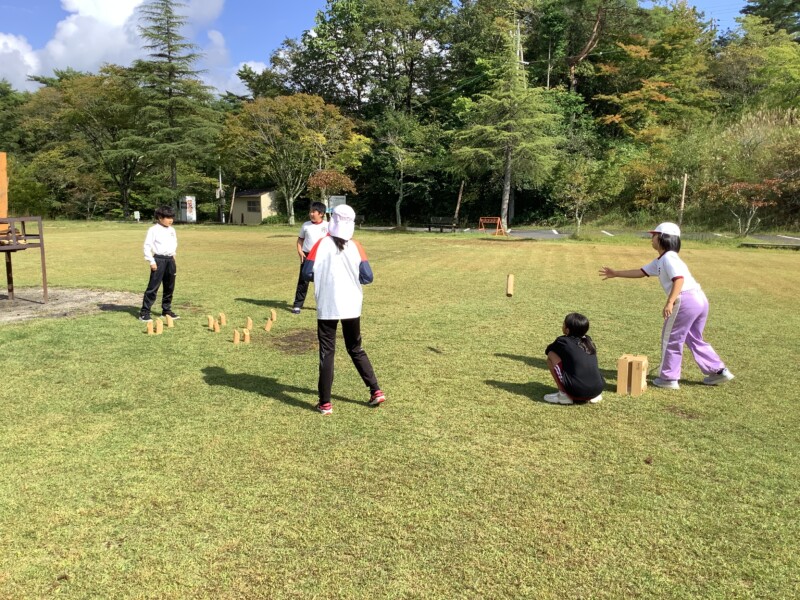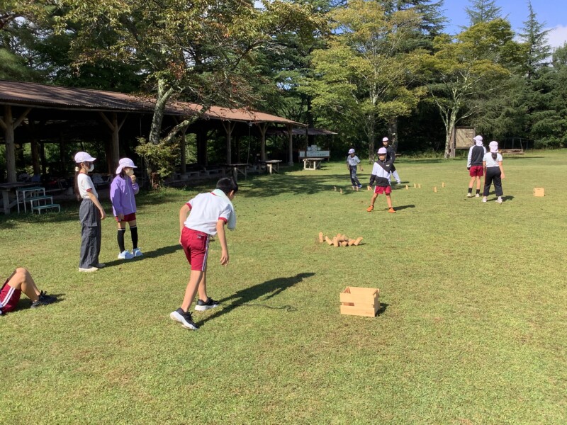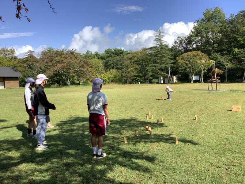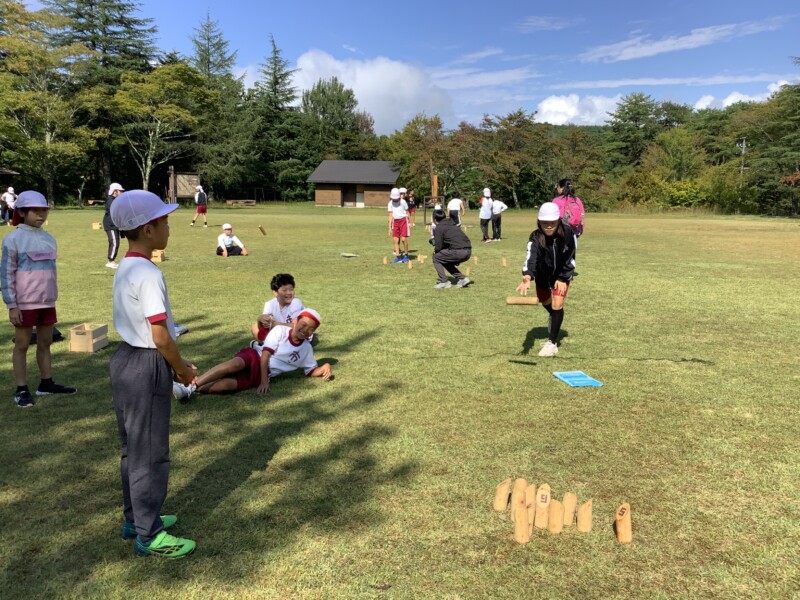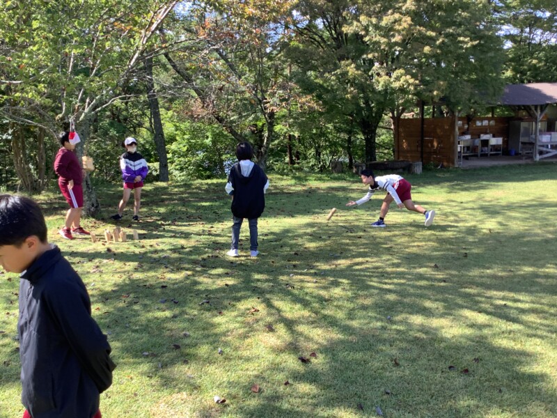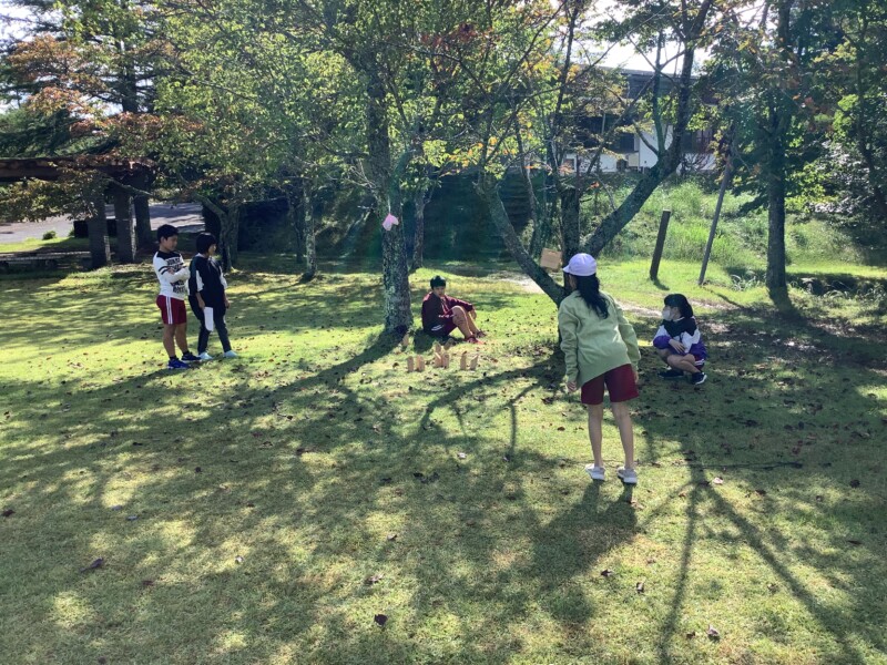 突然の待望の青空と太陽! そうしてきれいな緑の上でモルックを行うことができました。
