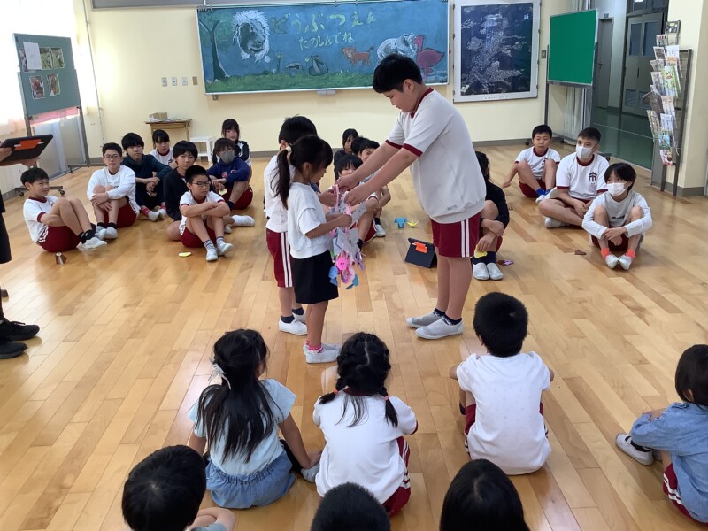 この時期は校外学習がたくさんあります。出発前に6年生が修学旅行でのお返しも兼ねて、てるてる坊主やお土産をプレゼントしてくれました。