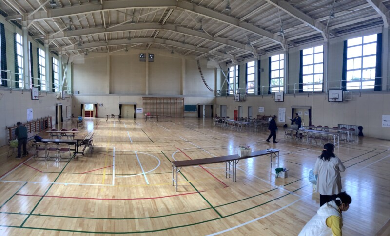 体育館いっぱいを使って授業が展開されるので、早くからセッティングです。