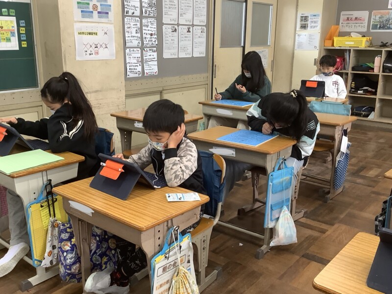 国語のガマさんのお話について、自分の好きな一文を抜き出して、その理由などを一生けんめいに書いていますね。