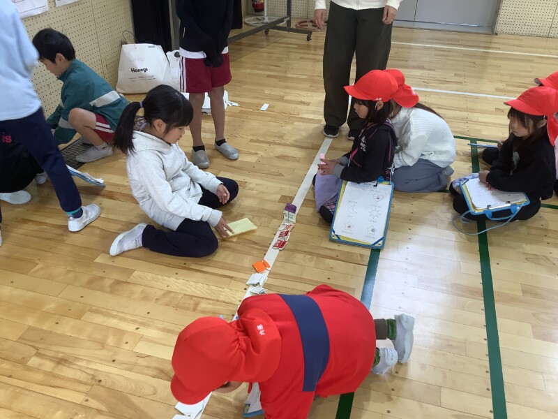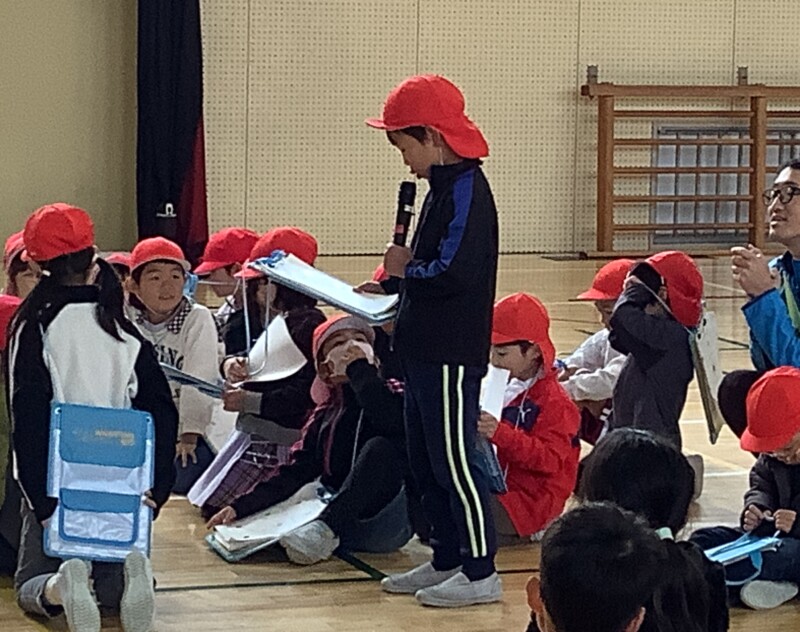赤白帽子をかぶっている子たちがゲストの1年生。帽子がない子がお世話をする2年生です。一生懸命に説明などをする2年生、興味津々で楽しそうに過ごす1年生の様子が伝わりますでしょうか?