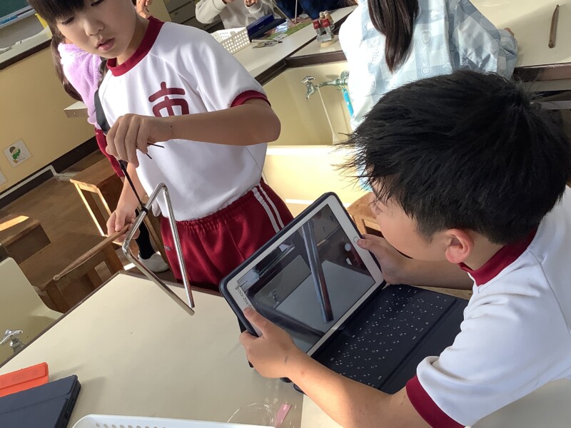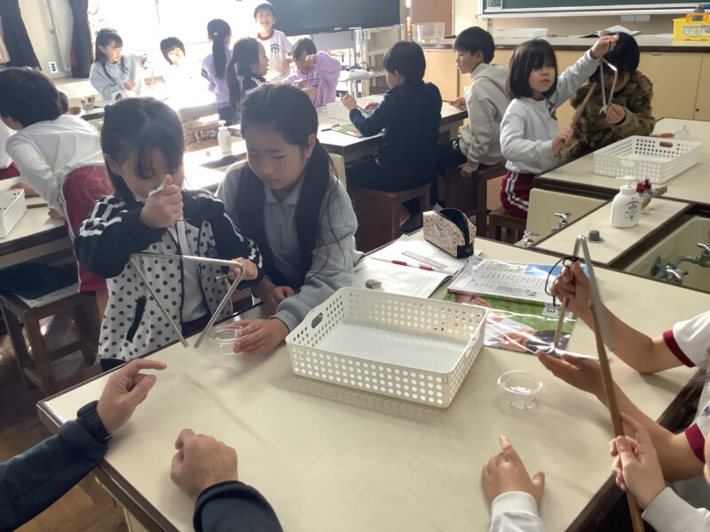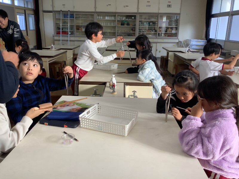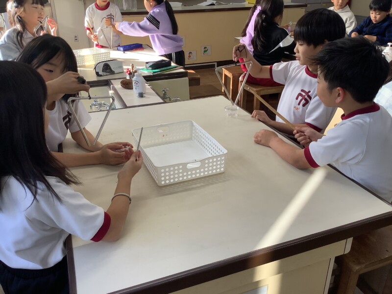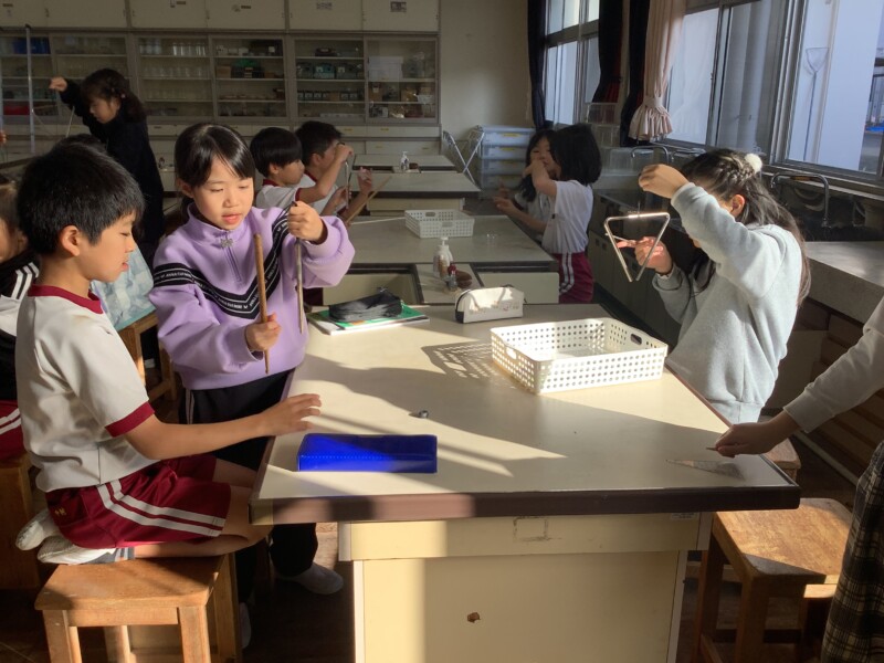 理科室を除くと、「音」の授業をしていました。トライアングルをたたいて、音と振動の関係を体験です。驚きと感動の声がたくさん上がっていました!