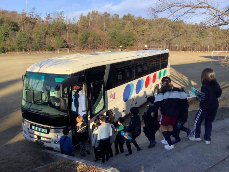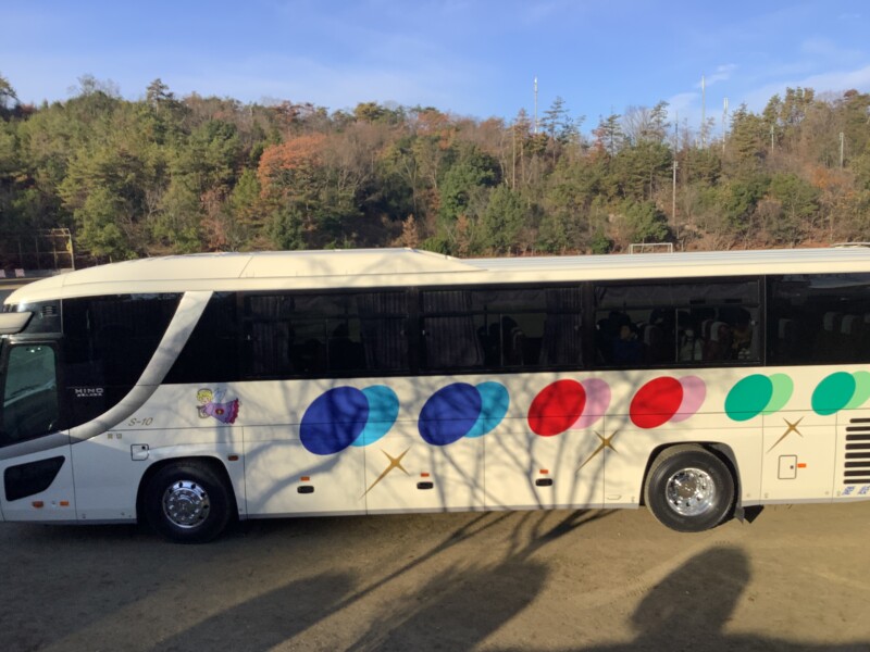 土砂崩れによる一部通行止めのため、う回路で会場に向かいます。そのため朝一番でバスに乗り込みます。少し緊張しているかな?