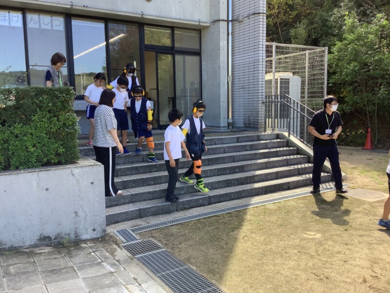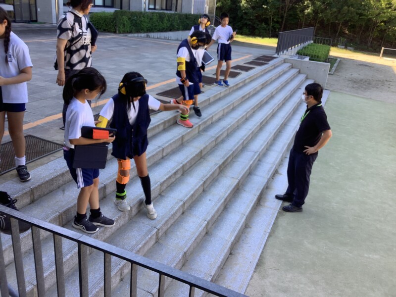 10月8日に5年生の総合の授業で、多治見市社会福祉協議会の方々を講師に招き、福祉体験を行いました。認知症や高齢者の方の特徴を聞きました。サングラス、イヤーマフ、ベスト、肘・膝・手首・足首のサポーターをつけて、体育館や運動場を歩き、高齢者の方や体に不自由なところのある方の模擬体験を行いました。体験セットを装着した身動きの不自由さと、実際に体が老いていく身動きの不自由さは違いますが、高齢者の方や体に不自由なところのある方の立場だったら階段の乗降は特に怖いだろうなと考えながら体験することができました。