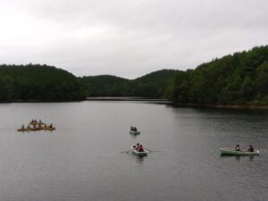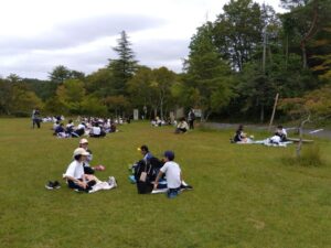 今はお弁当を食べ終わり午後の活動が始まっています。天気は曇り、野外で活動するには調度良い気温です。1組はボート、2組はモルックを楽しんでいます。このあと交代をします。