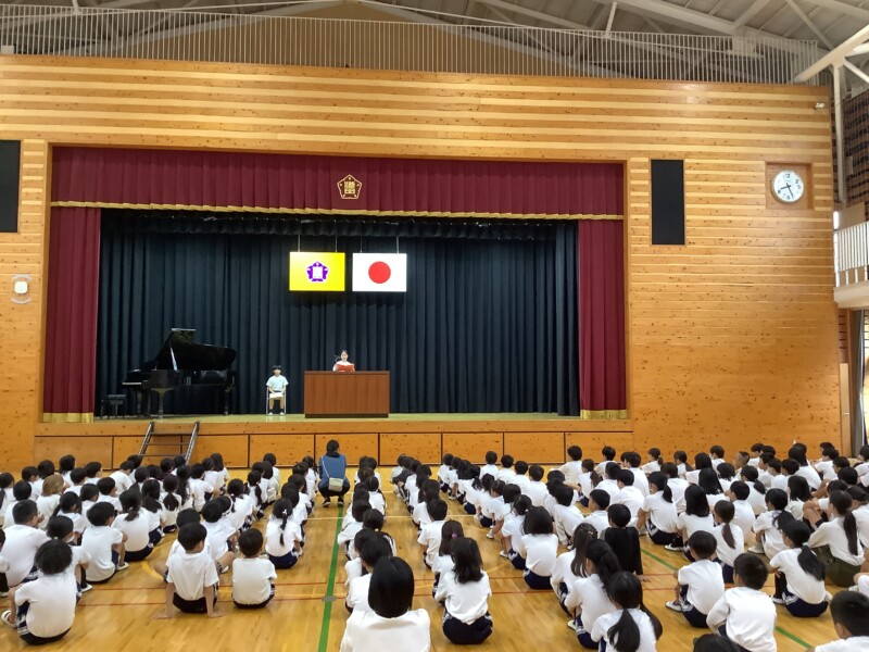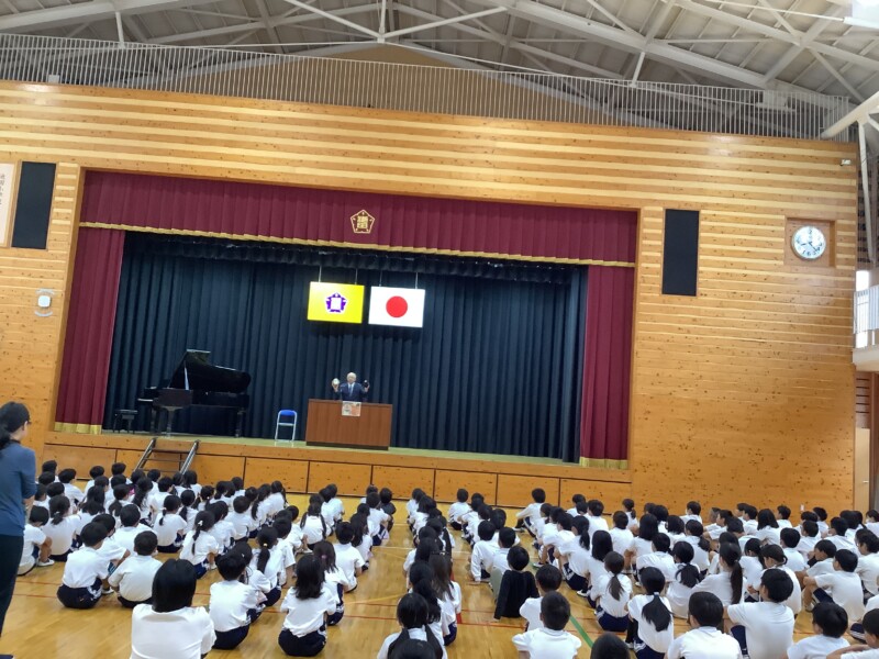 10月 14 2025 始業式 10月14日に後期始業式を行いました。学校長から、4匹のぬいぐるみを使い、早寝早起き朝ごはんの生活習慣を大事にしよう、仲間関係を大切にしようという話がありました。4年生代表児童は、挨拶活動や合唱の練習を頑張りたい、毎日続けることを大切にしたいという話がありました。児童会代表児童の話では、自分のため、周りのために頑張りたい、失敗しても諦めずに頑張りたいという話がありました。後期も毎日の積み重ねを大事にし、自分の財産を増やしていきましょう。