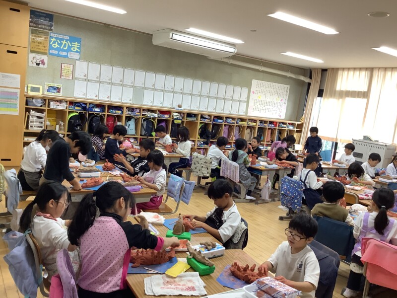 11月 18 2025 【2年生】思い出を形に 11月18日に2年生が、図工の「思い出を形に」の授業で粘土作品を作りました。魚や亀など思い思いの作品を作りました。小さい粘土をくっつけたり、角などのボツボツを引っ張り出したり、ヘラで模様を作ったり、上手にできました。