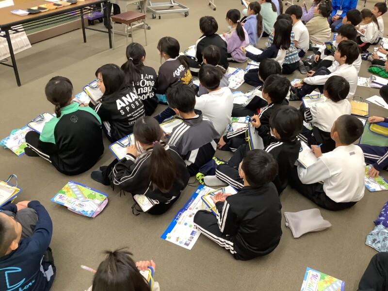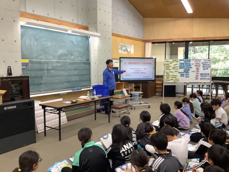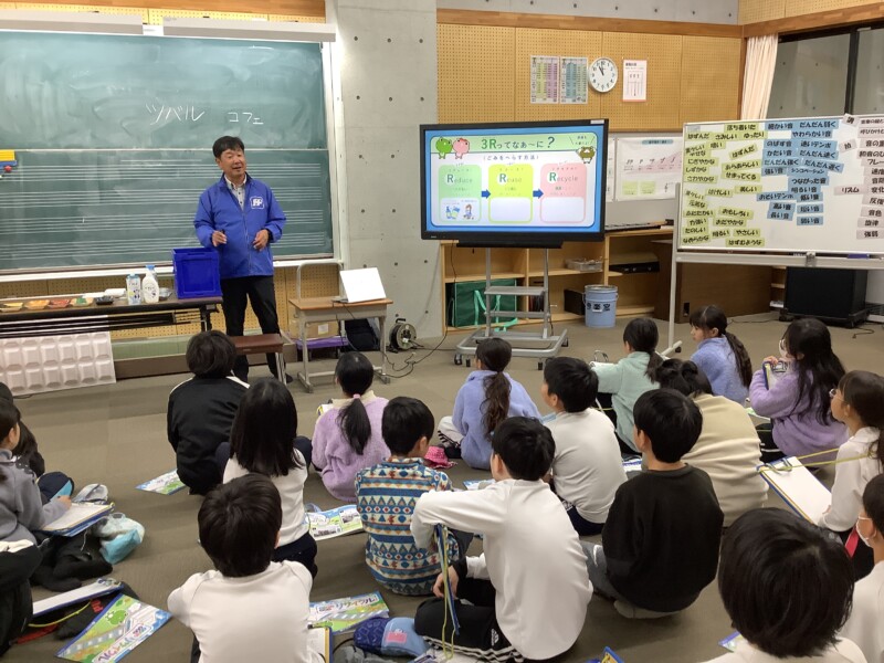 12月 04 2025 【4年生】エフピコ環境授業 12月4日に、4年生は総合的な学習の時間に、輪之内町で簡易食品容器を作っている「エフピコ」の方を講師に招き、環境問題について学びました。地球温暖化の原因の95%が人間の便利さによるものであること、1日1人当たり約850gのゴミを排出していること、なぜスーパーの皿は木や紙ではなくプラスチックでできているのか、などクイズに答えながら学びました。リサイクルという言葉は児童も知っており、環境問題への意識を一層もつことができました。