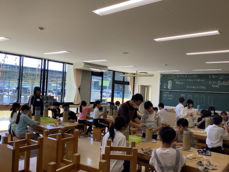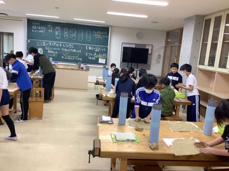12月 25 2025 【5年生】粘土の授業 12月22日と25日に5年生は、図工の授業で粘土作品を作りました。昭和小学校の図工の先生をお招きして、教えていただきました。筒形のランプシェードを作りました。もともと筒状なのかと思いきや、粘土のかたまりを平ぺったくして、筒に巻いて筒状にしています。色んな模様を付けました。灯りをつけるとどんな風に見えるか楽しみです。