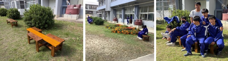 10月 28 2025 中庭ベンチ 中庭に素敵なベンチが3台設置されました。校務員さんが心を込めて、丁寧に作ってくださいました。天気がいい日の昼休みにベンチに座って、日向ぼっこをしながら、友達と楽しく過ごしてみるのもいいですね。