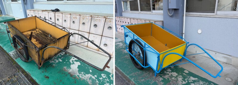 1月 28 2026 ビフォー・アフター 使っていないリアカーを譲り受けました。校務員さんが分解・部品交換・研磨・塗装と手をかけてくださり、見事に生まれ変わりました。今後、小泉ボランティアズの活動で活躍してくれます。乞うご期待!