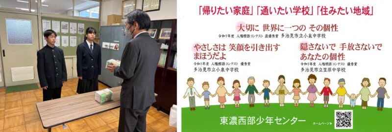 2月 05 2026 「帰りたい家庭」「通いたい学校」「住みたい地域」啓発マスク 人権尊重思想の普及高揚を図ることを目的に実施された「人権標語コンテスト」入賞作品を印刷した啓発マスクが出来上がり、東濃西部少年センターから受賞者へマスクの贈呈式を行いました。このマスクは1年生生徒全員にも配付されました。