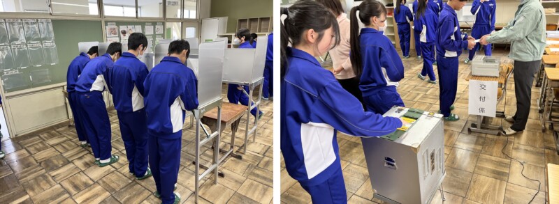 2月 24 2026 主権者教育(模擬選挙) 3年生が自分たちで練り上げた政策に基づいて、模擬選挙を実施しました。多治見市選挙管理委員会の協力で、先の衆議院議員選挙で使われた “本物” の投票用紙や投票箱を使った本格的なものです。生徒たちも緊張気味に投票していました。