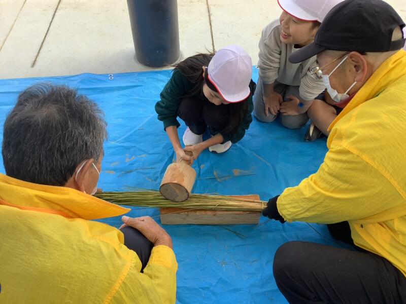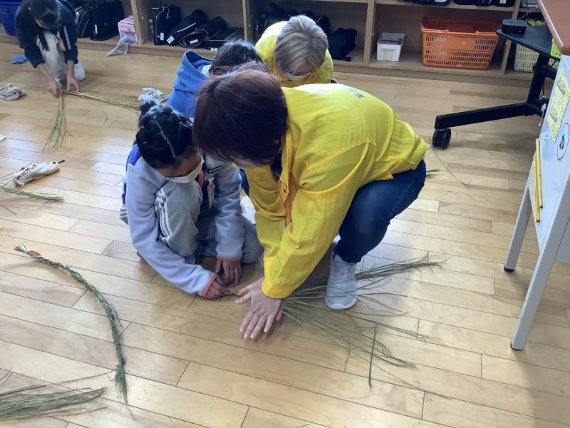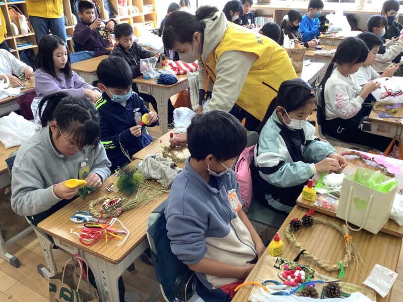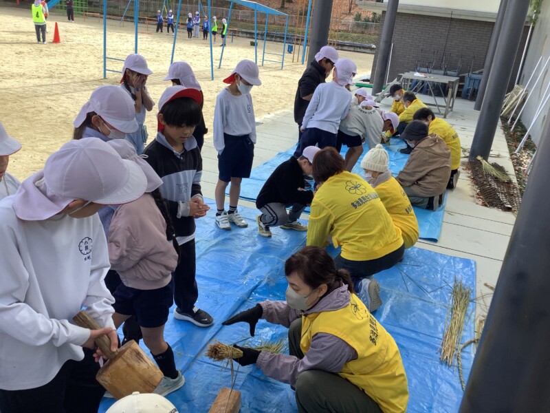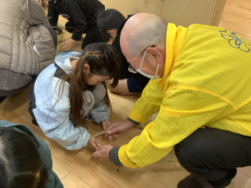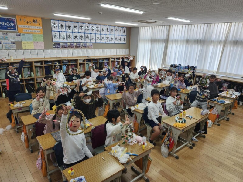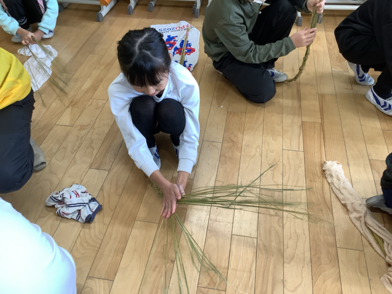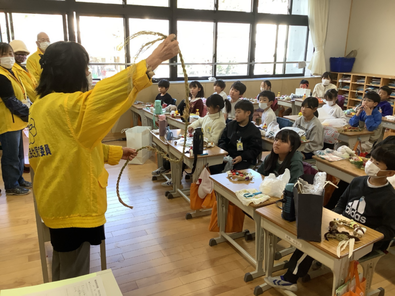 12月 05 2025 3年生 わらうち・縄ない・リースづくり 12月4日、5日に、3年生は民生委員の方々に教えていただいて、わらうち、縄ないをして、リースづくりをしました。子どもたちは、初めて手にするわらに戸惑いながらも、民生委員の方々の丁寧なご指導で、楽しく縄をなっていきました。最後には思い思いのクリスマスリースやしめ縄が出来上がり、みんなとてもうれしそうでした。民生委員の方々に教えていただく、小泉小学校伝統の行事です。2日間、本当にありがとうございました。