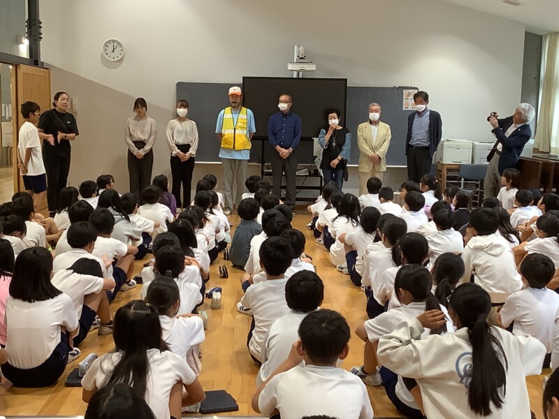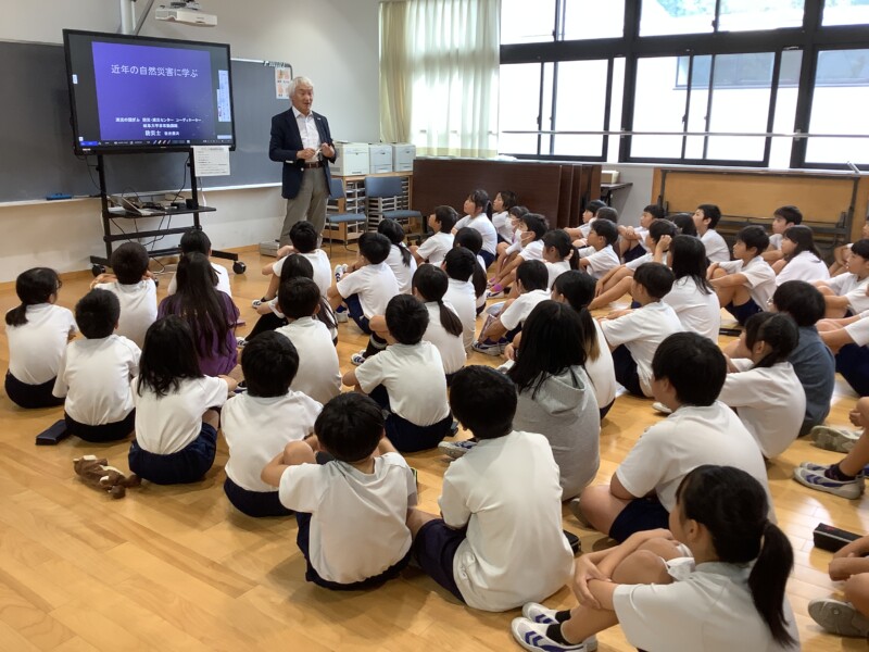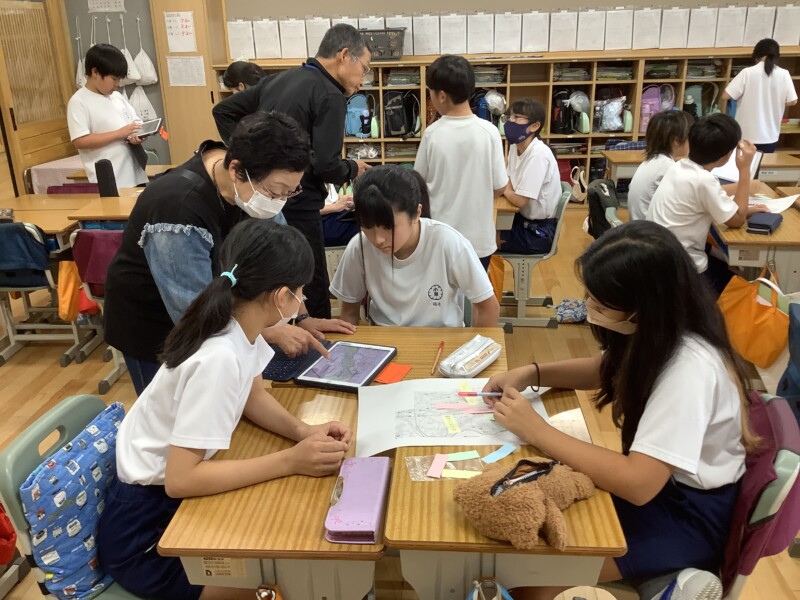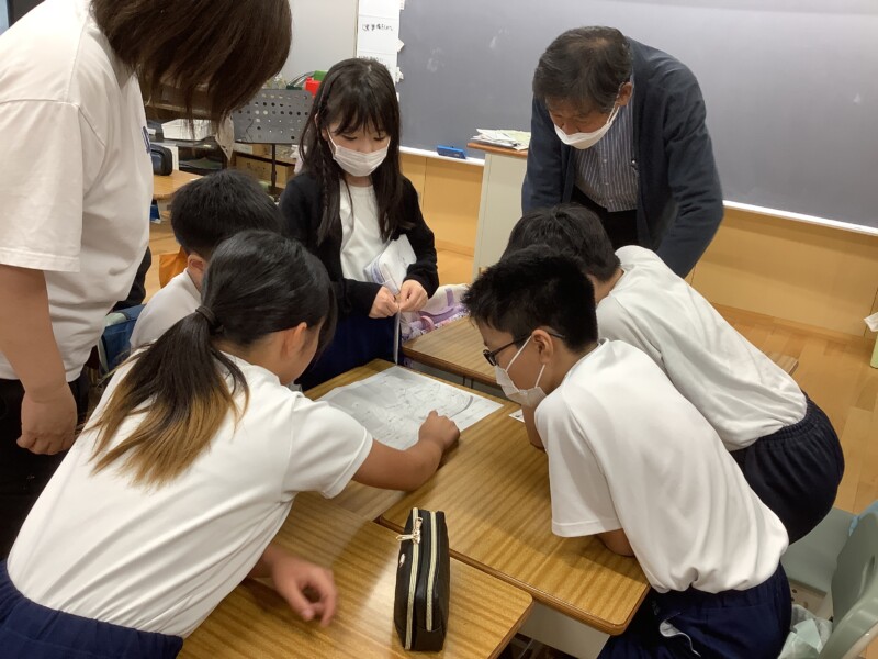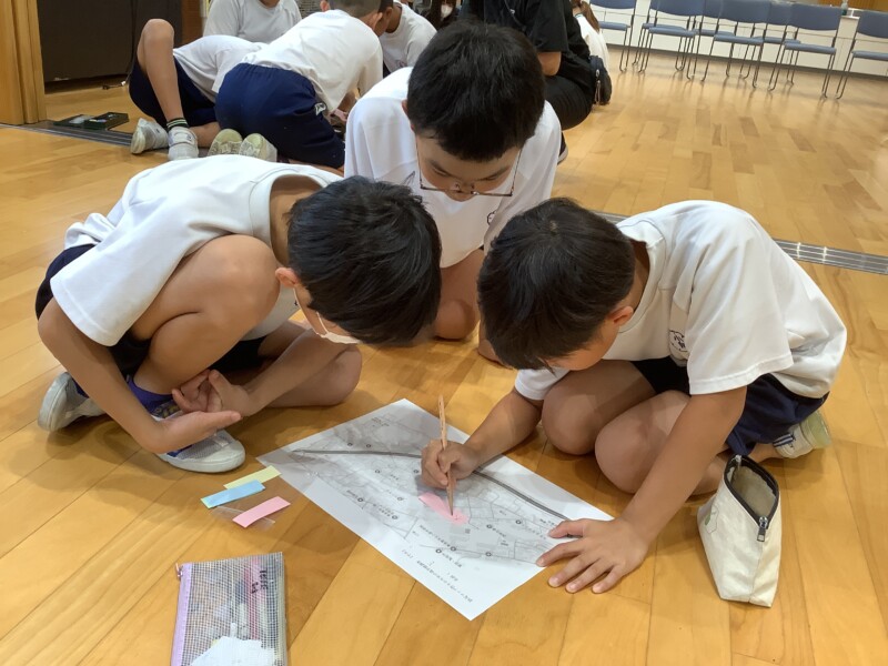 10月 17 2025 5年生防災学習 DIG訓練 10月16日(木)、5年生は総合的な学習で、防災学習のDIG訓練を行いました。防災士の岩井さんを講師にお招きし、「近年の自然災害に学ぶ」と題して、実際に自然災害が起きたらどうなるか、想像力を働かせながらお話を聞きました。その後、地域ごとに分かれて、自分の家の近く、通学路に潜む危険個所を見つけ、協力して地図を作成しました。また、地域の防災委員の方々も一緒に考えていただいたり、過去の災害について教えていただいたりして、アドバイスをいただきました。今後、通学路調査を行う予定です。