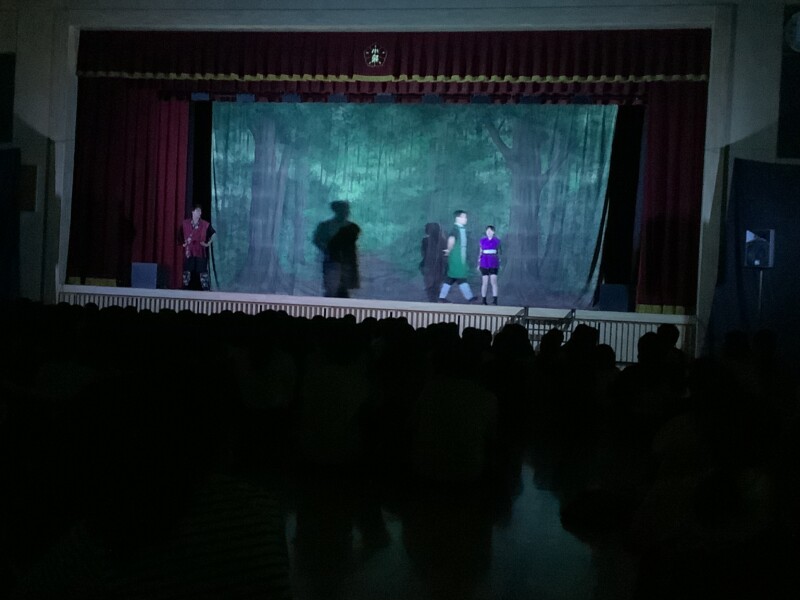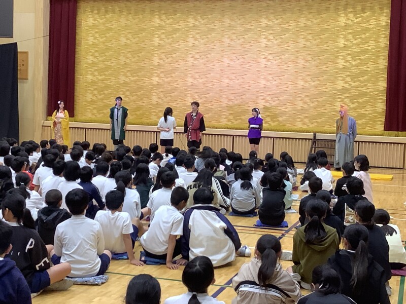 10月 23 2025 観劇「忍者サスケ」 10月23日(木)、劇団「あくろばっとカンパニー飛天」による舞台時代劇『忍者サスケ』を低学年、高学年に分かれて観ました。忍者のサスケ、ハヤテ、カエデが時にはぶつかり合いながらも、互いに忍者として成長していく友情物語です。笑いあり、迫力あり、とても楽しい劇でした。役者さんの演技を間近で観て、子どもたちの心に響く貴重な体験となりました。