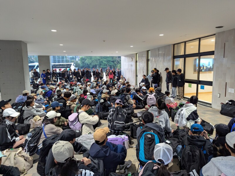 出発式の様子です。肌寒い朝でしたが、元気に出発しました。これから高速で奈良に向かいます。