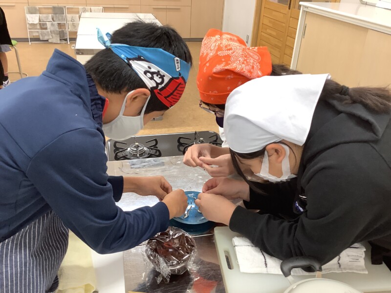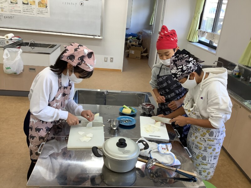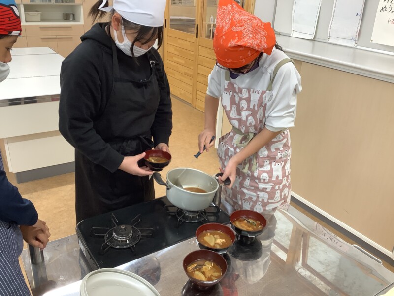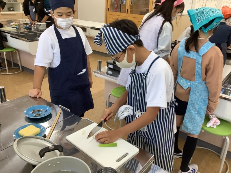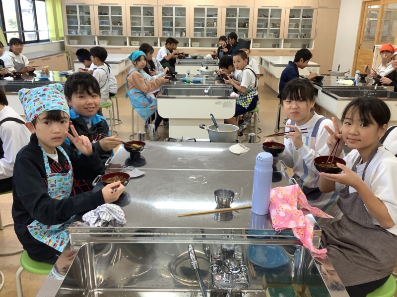 10月 30 2025 5年生調理実習 みそ汁づくり 5年生は、家庭科の調理実習でみそしるを作りました。煮干しを使ってだしをとり、大根、油揚げ、ねぎを大きさに気を付けながら切りました。「先生、もうみそ入れていいかな?」と何度も大根の煮え具合を確かめながら、みそを溶かして完成!だしのうまみがきいたおいしい味噌汁が出来上がり、「おいしい!」みんな笑顔で試食しました。班の仲間と協力して片付けまできちんとやり切りました。