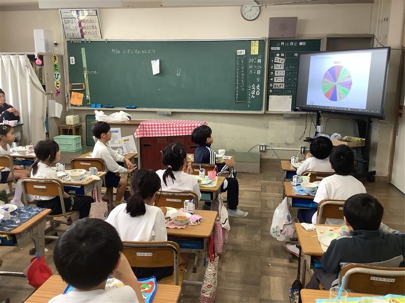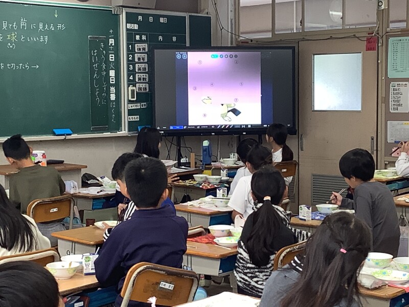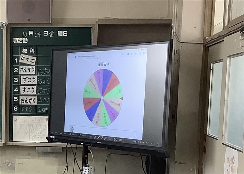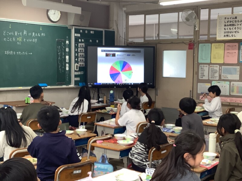 夏休み明けから本校にEZCastという機器を導入しました。これを使うと放送室からの映像が簡単に各教室のモニターに映し出すことができます。5・6年の情報委員会が毎日の給食のお昼の放送を担当しています。このお昼の放送では、このシステムを使って楽しい企画をいろいろと考えています。ルーレットによる星座占いやキャラクター当てクイズなどタブレットの機能を使って楽しい企画を放送しており、全校も楽しんでいます。あまりに夢中になりすぎて給食をおろそかにしないようにしたいですが、情報委員会はみんなのためによく頑張っています。