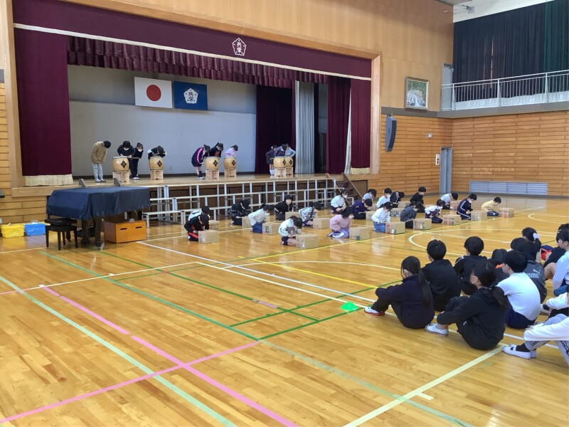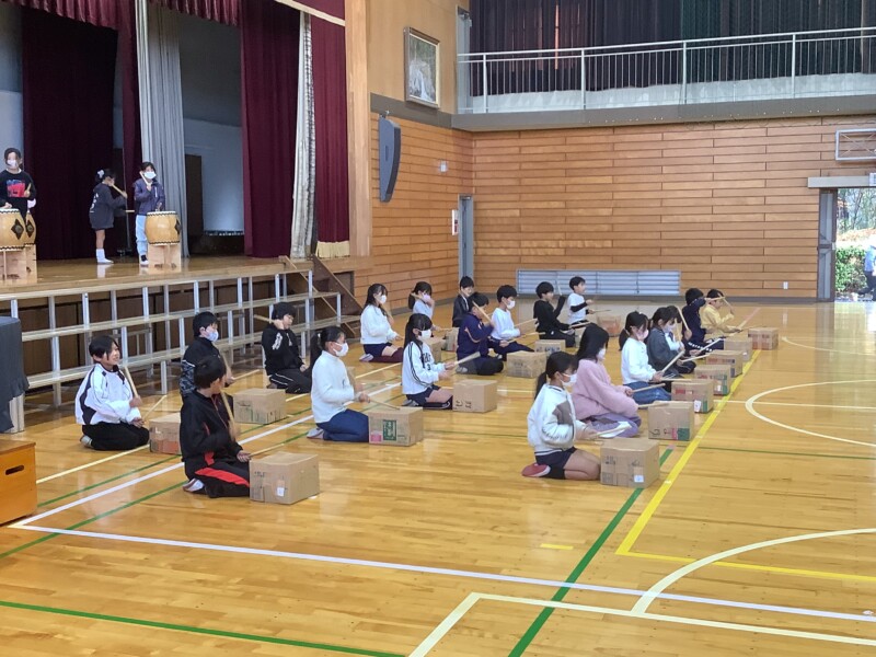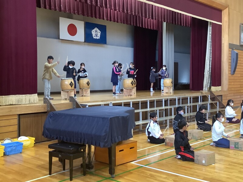 12月 01 2025 全校に向けた宮太鼓の発表(3年生) 28日(金)の朝活動の全校集会で3年生がこれまで練習をしてきた宮太鼓を披露しました。当日は3年生の保護者様も多く参観にきてくださいました。共栄文化祭では有志だけでしたが、今回は全員での発表になりました。人数も多くなりましたが、掛け声と太鼓を合わせて揃った太鼓の音色を披露しました。発表後は自ら挙手をして、他学年の子どもたちが感想を言うことができ、よい集会となりました。