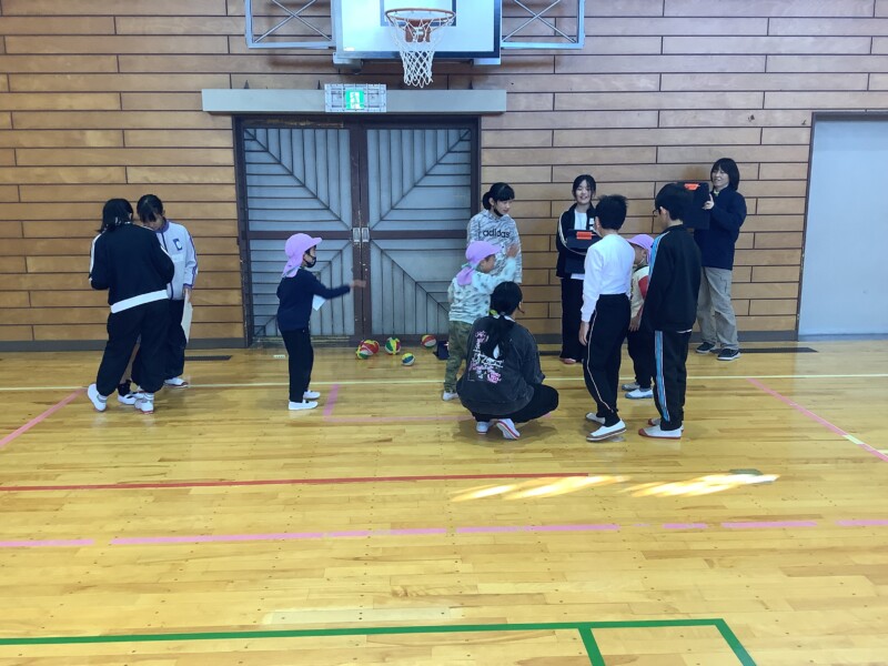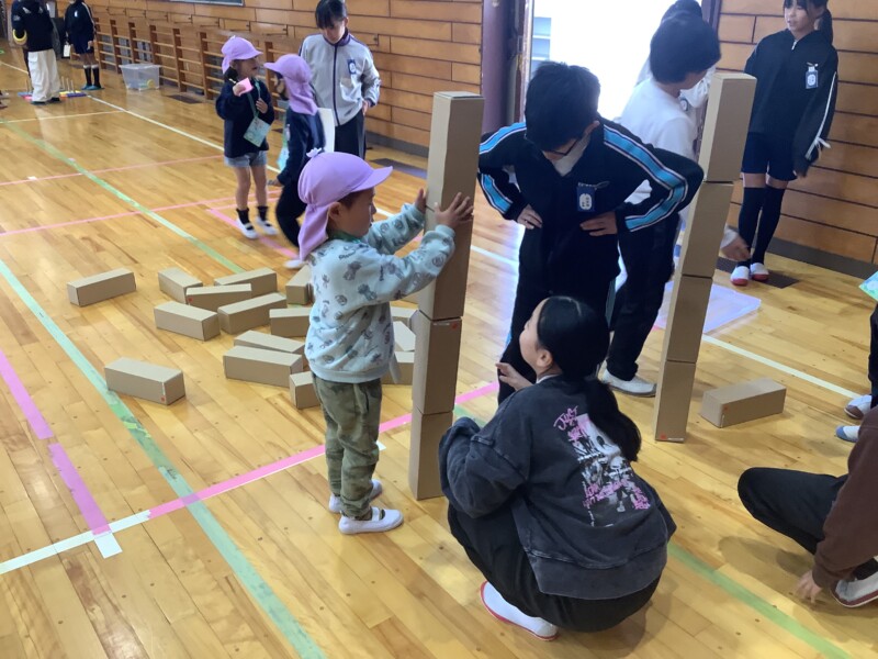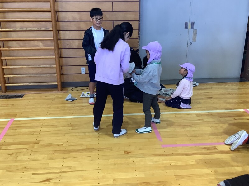 11月 21 2025 共栄保育園との交流会(5年生) 5年生では総合的な学習の時間で多様な他者との関りを学ぶ学習を行っています。その一つとして共栄保育園の園児との交流を定期的に行っています。今回が2回目の交流となります。今回は年長の園児を小学校に招いての交流となりました。体育館にグループごと様々な遊びのブースを作って年長さんたちが、それぞれ自分の遊びたいブールにいくと5年生が笑顔で接し、遊び方を教えている姿がありました。あと4ヶ月もすると年長さんも小学校に入学します。今日の活動で、安心して小学校に行ってくれるといいです。
