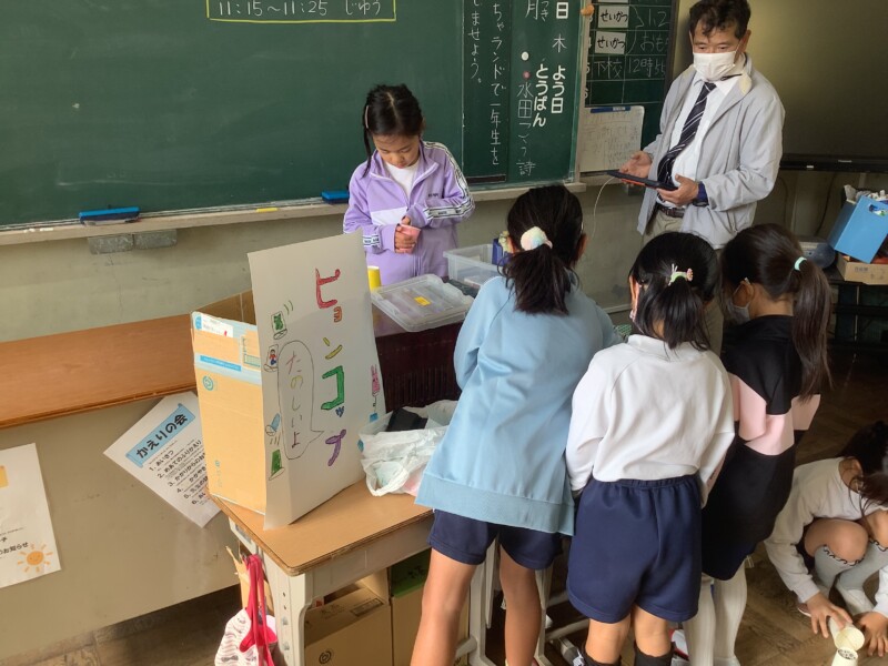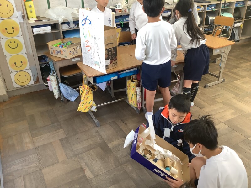 12月 03 2025 おもちゃランド(1・2年生) 先週、2年生が生活科で様々な材料を使っておもちゃをつくりました。グループごとにおもちゃで遊ぶブースを開いて、1年生を招待しておもちゃランドが開かれました。2年生は1年生に話す原稿をつくったり、役割分担をしたりして、1年生を上手にお迎えしていました。また、1年生はグループごとのブースをめぐり、楽しそうに遊ぶ姿ありました。1・2年生の廊下が歓声や笑顔であふれる時間となりました。