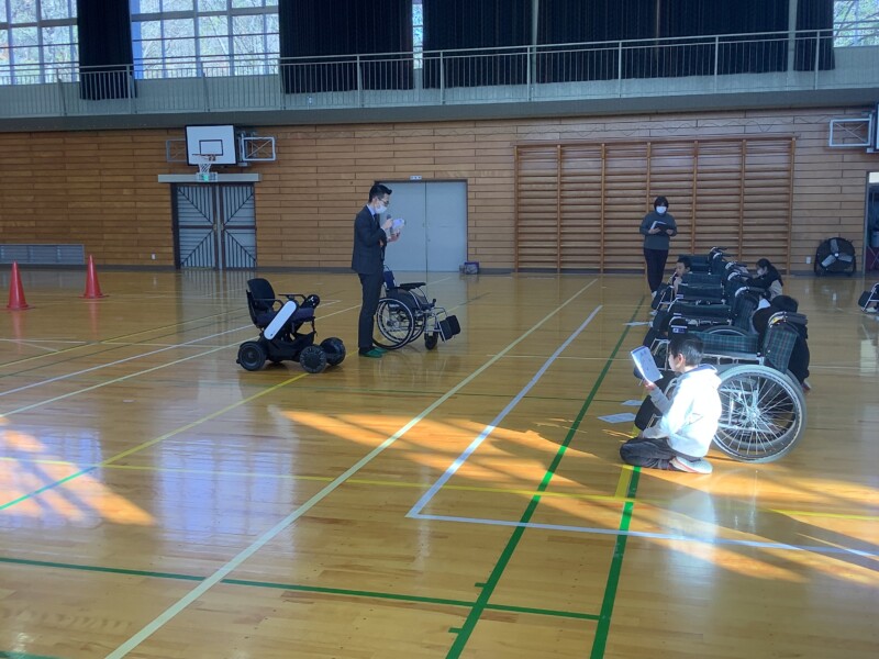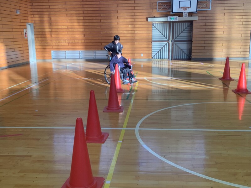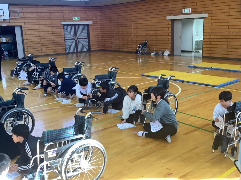 12月 12 2025 車椅子体験(5年生) 総合的な学習の時間の福祉学習の一環で、午後から車椅子体験を行いました。それぞれの学級ごとに1時間の授業の中で車椅子の特性や操作の仕方を聞くだけでなく、実際に自分たちも車椅子に乗ってみました。コーンのスラロームを通ったり、斜面を後ろ向きで降りたり、マットを使って段差を登ったりしました。後ろ向きに下がっていく恐怖感や段差を押して上がる難しさを身をもって体験することができました。