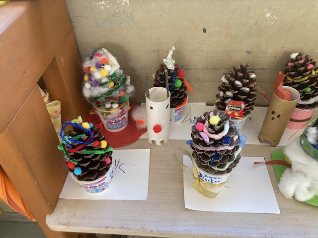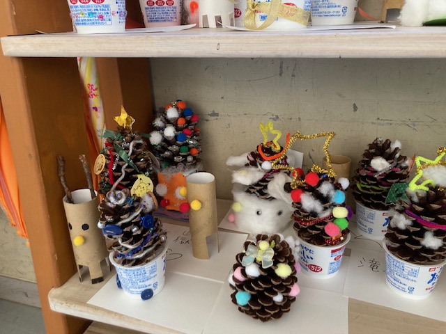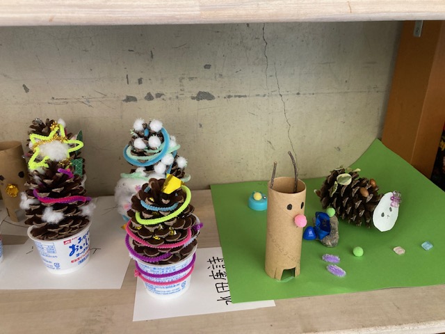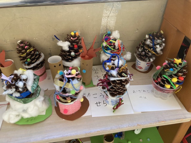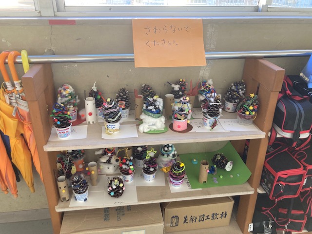 12月 15 2025 クリスマスに向けて(2年生) 2年生の廊下には一人一人が図工の時間に松ぼっくりで作ったクリスマスツリーが並んでいました。担任の先生に「とてもかわいいクリスマスツリーですね」とたずねると「クラスの保護者の方が大きな形のよい松ぼっくりをくさだったんです。それを使ってみんなで作りました。」と教えてくれました。さらに「とてもかわいいですよ。」と誇らしげに話してくれました。クリスマスまであと10日足らずとなりました。子どもたちもなんだかワクワクした表情にみえます。