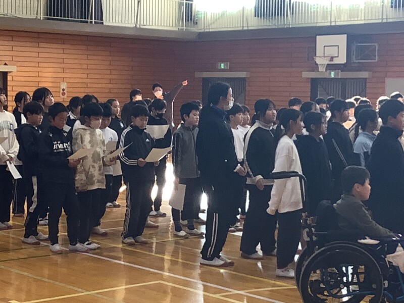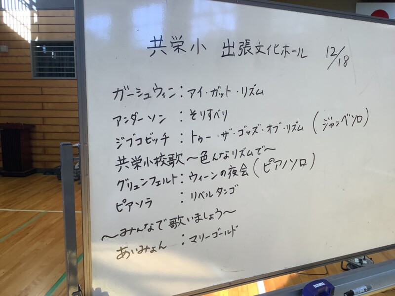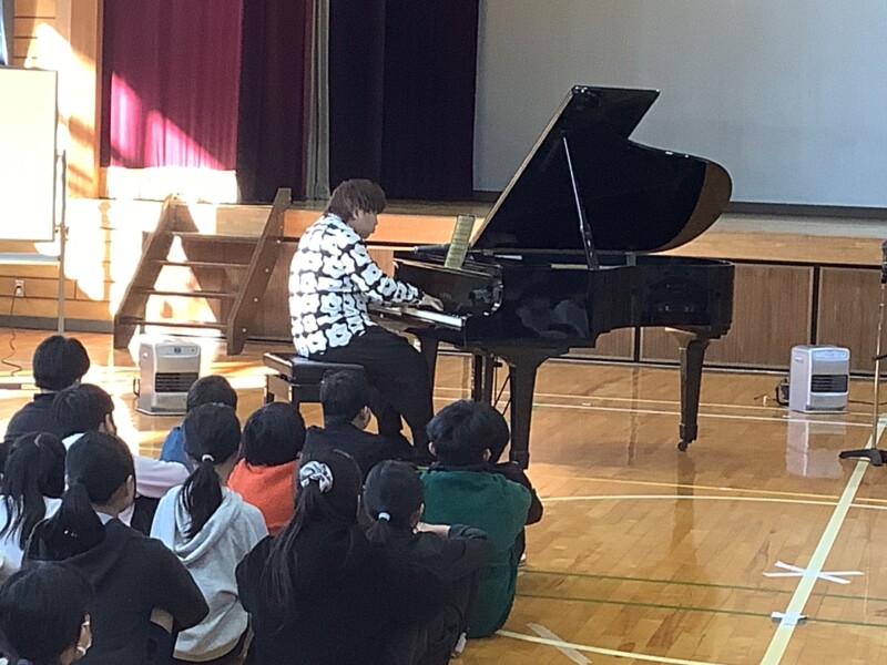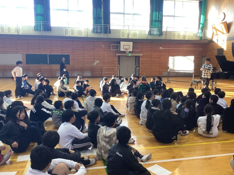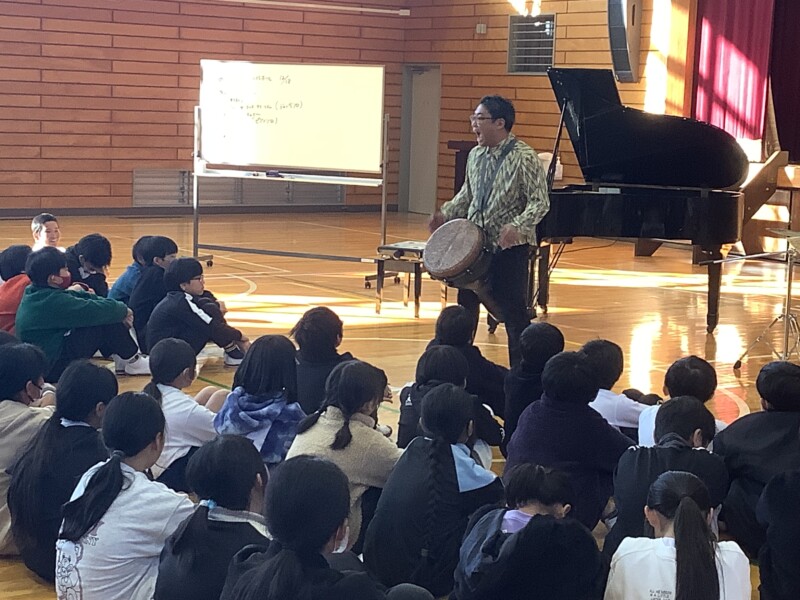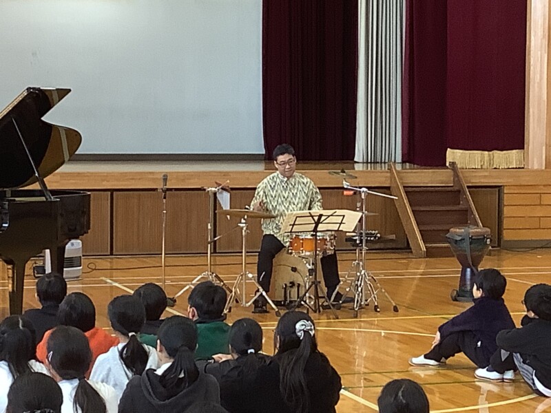 午後から体育館で5・6年生がピアニストの古田さん、パーカショニストの中村さんのお二人のアーティストをお招きして演奏を聴きました。古田さんは昨年度に引き続きになりますが、今年度はパーカッションとのセッションの演奏を聴かせていただきました。質問コーナーもあり「なんでパーカッションをやろうと思ったのですか」という子どもからの質問に「太鼓は世界中でいろんな太鼓が必ずあって、それぞれに違って魅力的だ」と答えていただき、子どもたちも納得して中村さんのお話を聞いていました。最後はお二人の演奏に合わせて全員で「マリーゴールド」を歌い、演奏と子どもたちの歌声が一体となった時間を過ごすことができました。