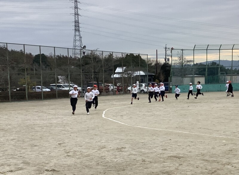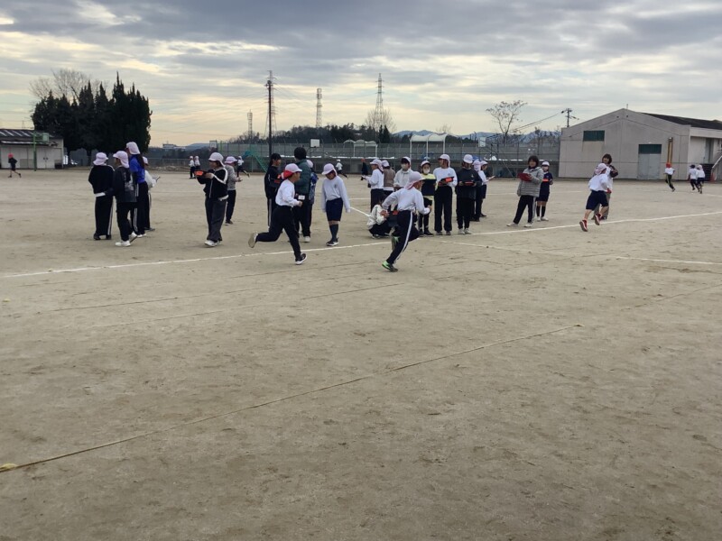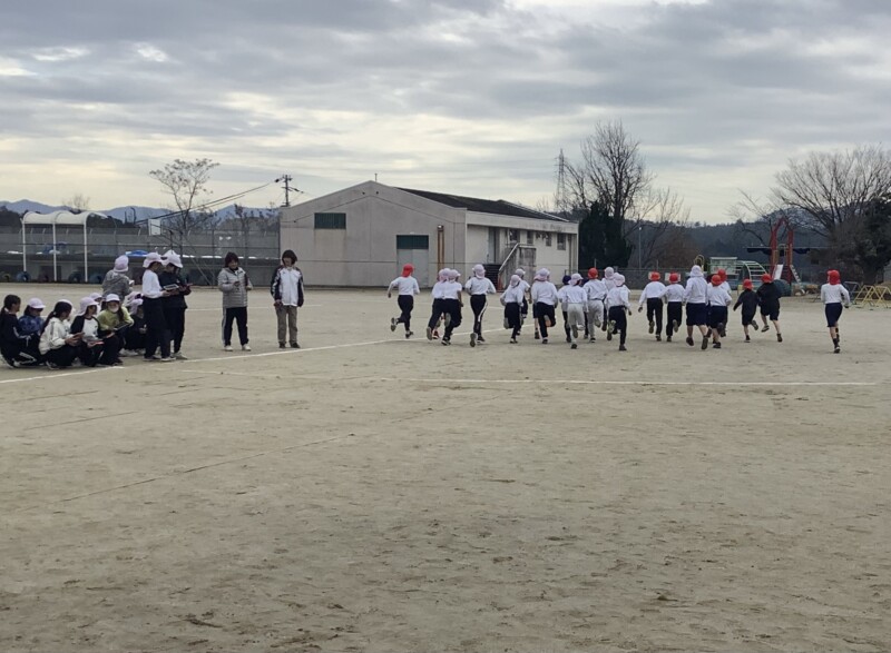 1月 13 2026 ペース走の授業 冬休み明けは気温が低く、風の強い日が続いていますが、多くの学年の体育の授業でペース走を行っています。今日は1、3、5年生の子どもたちが運動場に出て体育を行っていました。ペース走は自分の体力に合わせたペースで走りきることを目標としています。低学年では、自分のペースをつかむことが難しいですが、何度も授業を行っていく中で、同じペースで、できるだけ速く走りきるよう取り組んでいます。また、どの学年もペアの子に「がんばれ!」と声掛けをする姿があり、とても素敵でした。寒さに負けず子どもたちも頑張っています。