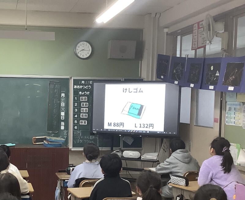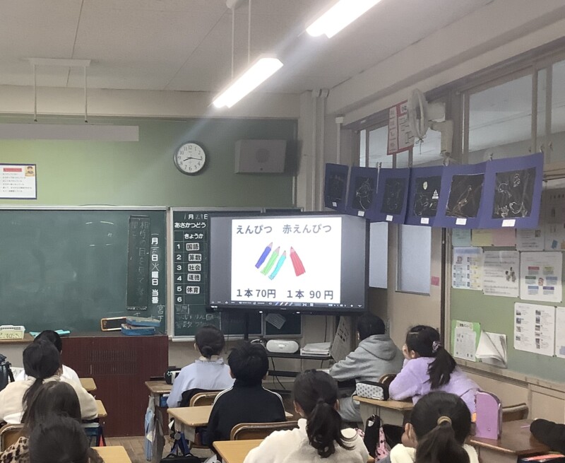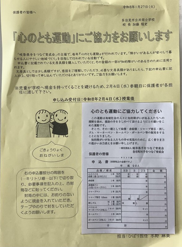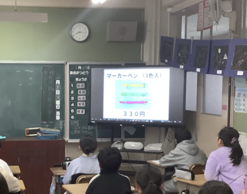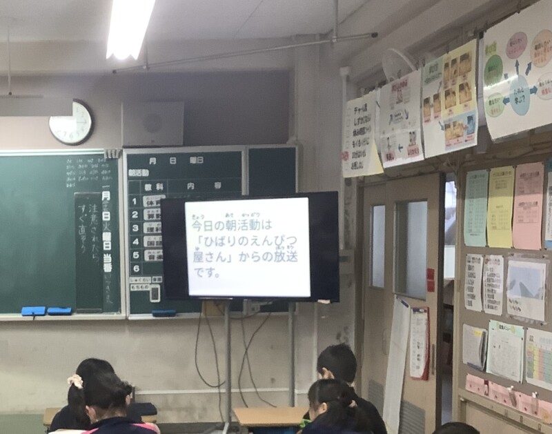 1月 27 2026 「心のとも運動」のお知らせをしました(ひばり学級) 朝活動の時間にひばり学級の5年生2名がテレビ放送を使って「心のとも運動」のお知らせをしました。「テレビの前で話すのは全然緊張しないよ」と落ち着いた話しぶりでした。各学級ではひばり学級の子どもたちが説明をするのを真剣に聞いていました。販売する文房具やその値段などをカードを使って分かりやすく話をしていました。各学級で、申し込み用紙が配られます。希望者は来週の参観日に保護者の方が持ってくることになっています。ぜひ、ご家庭で相談していただき、参観日に忘れずにお持ちください。