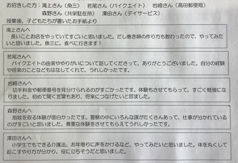 2月 20 2026 地域の方々による職業講話(6年) 19日の午後から6年生を対象に地域の5名の方にきていただき、職業講話をしていただきました。校区にも様々な職業に携わってみえる方々がいます。そんな方々にお声かけして、今年もこの会が実現しました。実際に仕事の様子を体験させてもらったり、仕事をやっているうえでの思いを話してもらったりと、距離が近いからこそ学べることも多くあったことが子どもたちの感想からもうかがい知れました。