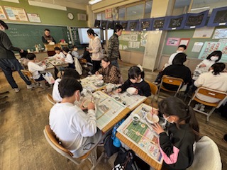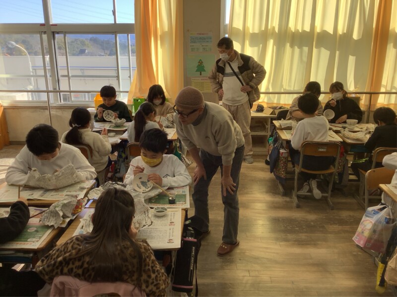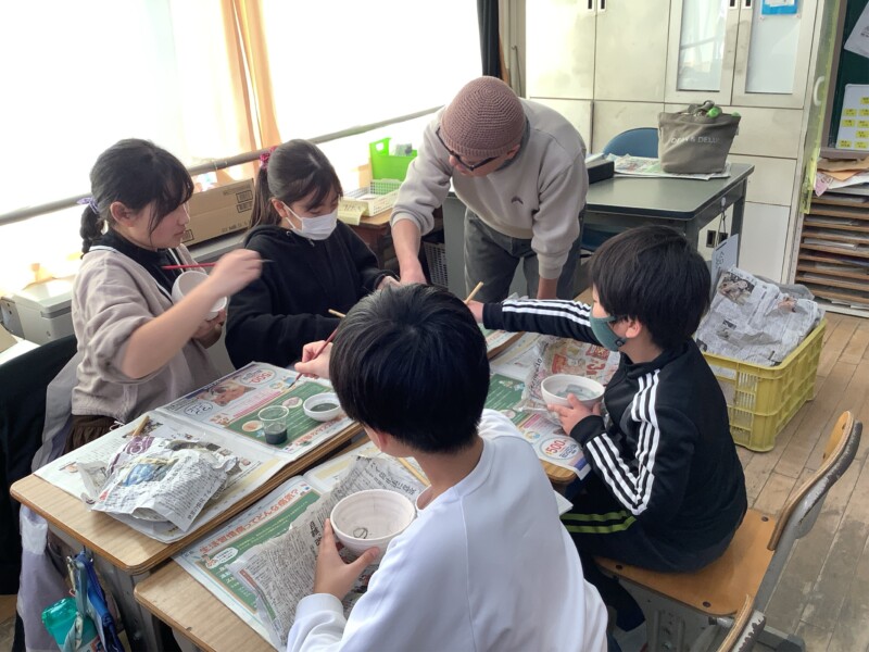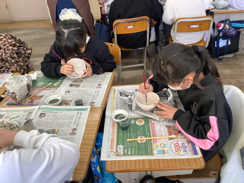 2月 24 2026 茶碗の絵付け体験(4年生) 19日(木)の午後から校区の陶芸家若尾誠さんに来ていただき、茶碗の絵付けを体験しました。昨年の11月に自分でろくろを使って作ったご飯茶碗を素焼きしていただきました。その茶碗に自分で絵や文字を書いていきました。事前に下書きを鉛筆でうっすらと書いていましたが、子どもたちは真剣な表情で失敗しないように絵付けをしました。当日は若尾様のほかにもお手伝いに来ていただき、貴重な体験をすることができました。この後、本焼きになりますが、出来上がりが本当に楽しみです。
