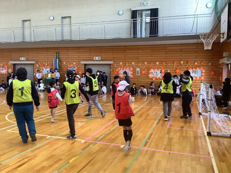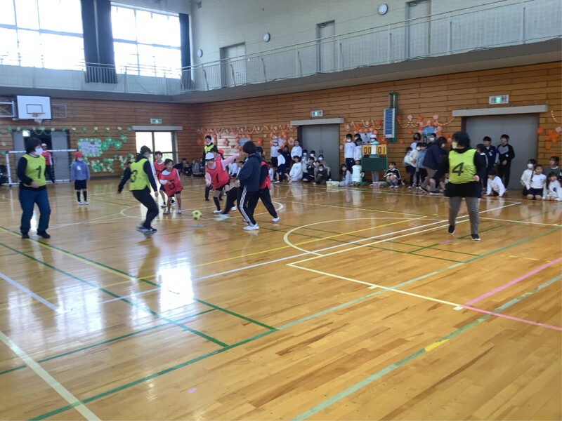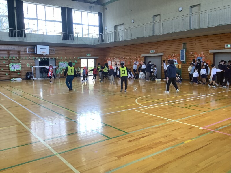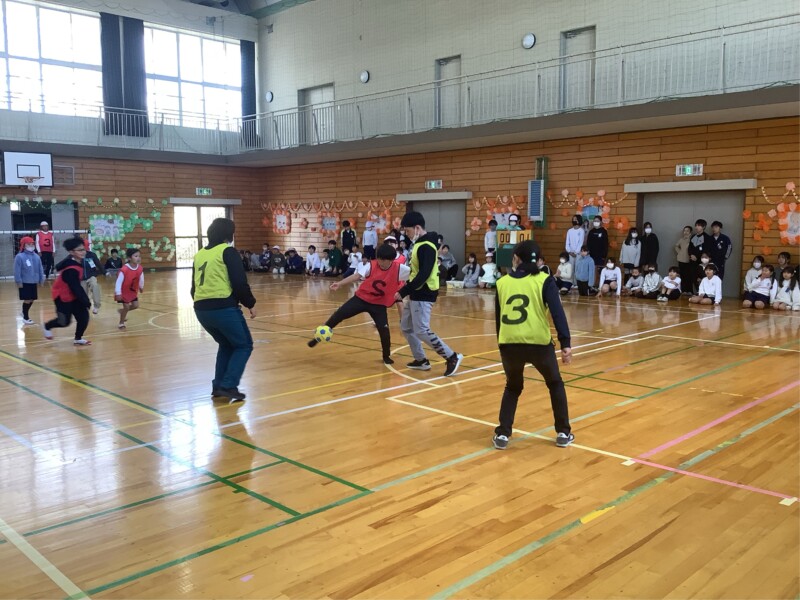 3月 05 2026 先生チーム対「なかよし」グループのフットサル 昼休みに「なかよし」グループ対抗のフットサル大会を行っています。トーナメント方式で行っていますが、準々決勝から先生チームも参加しての試合が始まりました。昨日(4日)は先生チームと勝ち進んだ「なかよし」グループとの対戦でした。体育館には多くのギャラリーも押し寄せ、大きな盛り上がりをみせました。結果は1対0で先生チームの勝ちでした。いよいよ準決勝で再び先生チームが登場します。