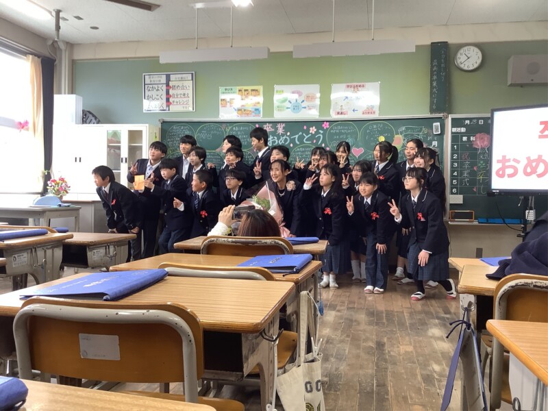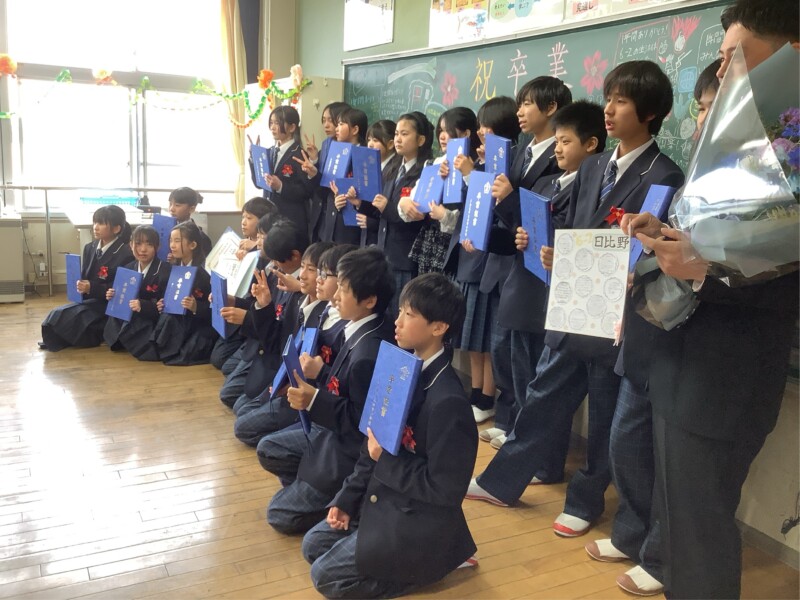 3月 25 2026 卒業証書授与式 令和7年度の卒業証書授与式を無事に行うことができました。教育委員会、市議会議員、学校運営協議会の来賓をお迎えして、厳かな雰囲気の中でも、温かな式になりました。子どもたちの多くは進学する中学校の制服をきていましたが、少し大きめの制服がほとんどで、とても新鮮な感じがしました。卒業の言葉や旅立ちの日にの合唱では、これまでの思いを込めて素晴らしい掛け声や歌声を聞かせてくれました。そして、いよいよ明日は修了式、離任式で、令和7年度も最後の一日となります。