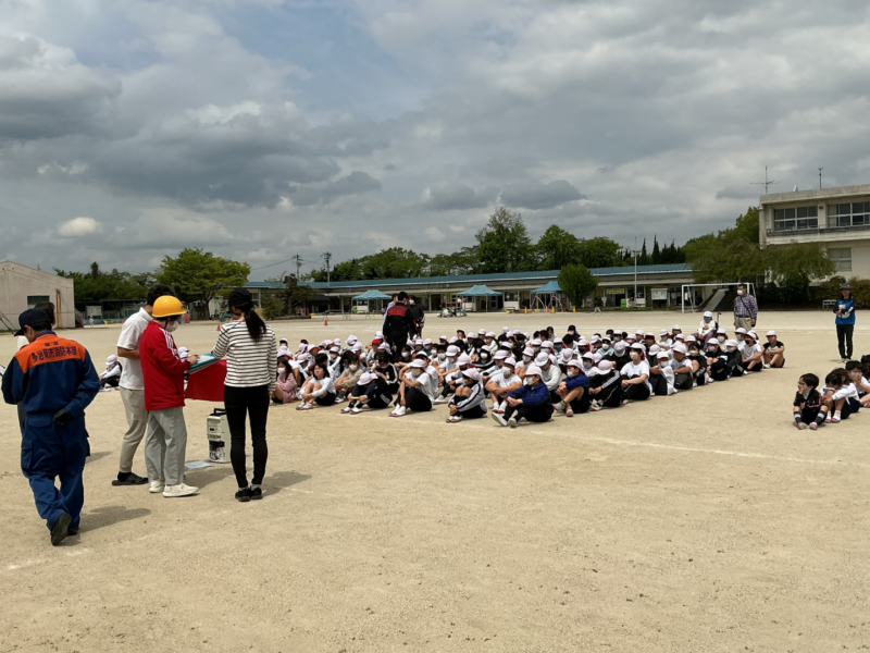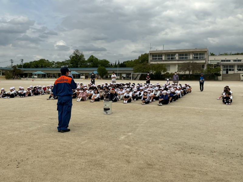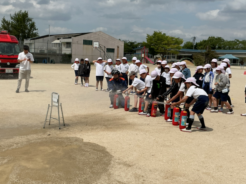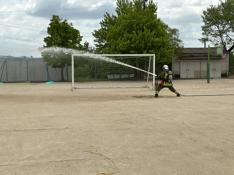 というキーワードを意識しながら、とてもしっかり行動することができました。消防士さんからも、その様子を褒めていただきました。その後は、共栄小学校の卒業生でいらっしゃる消防士さんから、放水の様子を見せていただきました。きびきびと動く姿・火を消すための放水を見せていただき、児童は大きな拍手を送っていました。その後は、4年生が消火器訓練を実施しました。代表児童が的にめがけ、消火器を使って消火体験をしました。
