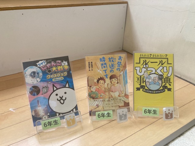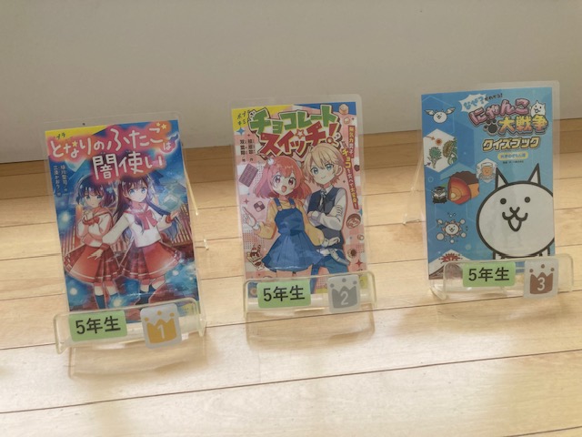 9月 30 2025 e-libraryのランキングベスト3 2~6年生の子どもたちは現在、タブレット端末でe-libraryというアプリを使って朝読書や授業のすき間の時間、休み時間に読書をしています。校舎の階段の踊り場には図書館司書の先生が各学年の人気ベスト3を掲示していただきました。図書館で本を手に取って読むことも大切にしていますが、アプリから手軽に本に触れるe-liburaryもどんどん活用してほしいと願っています。