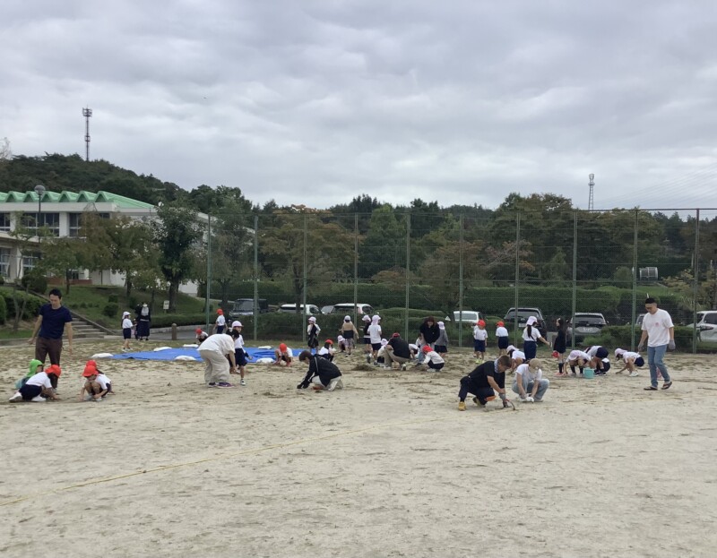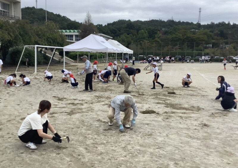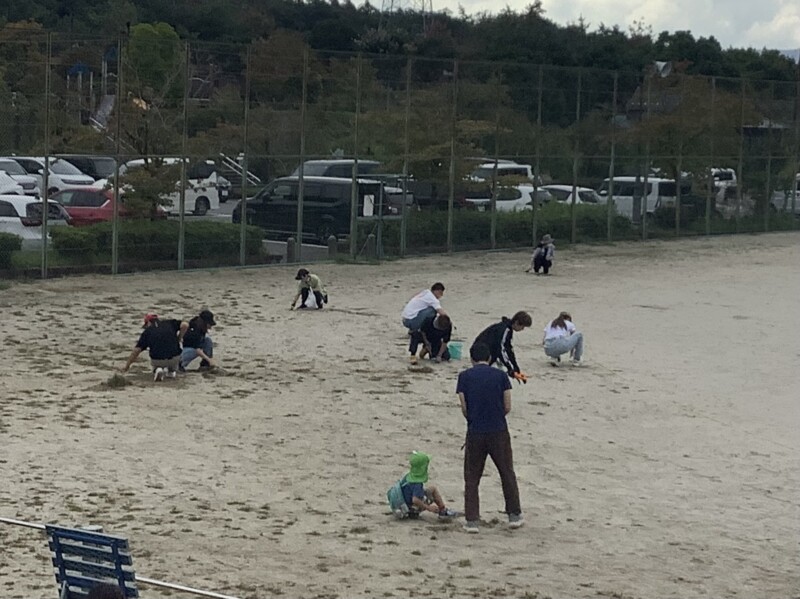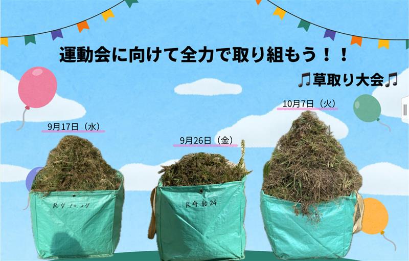 朝活動の時間に運動会に向けての草取りを行ってきました。今日の草取りが最後となります。地域の方や保護者の皆様も多くご参加いただきました。今回は、今まで以上に子どもたちと一緒になって草取りをしていただく姿が目立ちました。子どもたちも親さんが来てくださると笑顔でいっぱいでした。また、地域の方とお話をしていると「隣の家の子が一緒に草取りしよう言っていたので来ました!」という方も見えました。毎回、お昼にモニターを使って取れた草の量を紹介していますが、今回がこれまでの中で一番とれました。地域の皆様、保護者の皆様ありがとうございました。