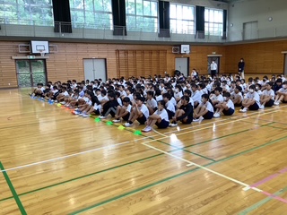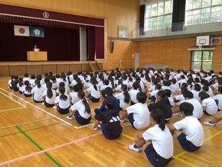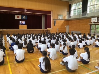 10月 13 2025 前期終業式 10日(金)の3時間目に全校で前期の終業式を行いました。体育館に全校が集合するのは久しぶりでしたが、6年生が先に入場し整然と整列をする姿を手本に示してくれました。そのおかけで全校が整然とした雰囲気で終業式を迎えることができました。校長は当日、出張で不在のため大型モニターでの話となりましたが、きちんと内容を聞き取ろうとする姿みられました。また、児童代表の話では5・6年生の代表が前期を振り返って自らの財産となったことを立派に話すことができ、それを認め合う大きな拍手が体育館に響きました。